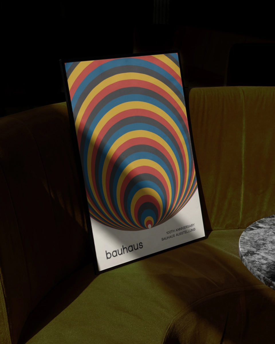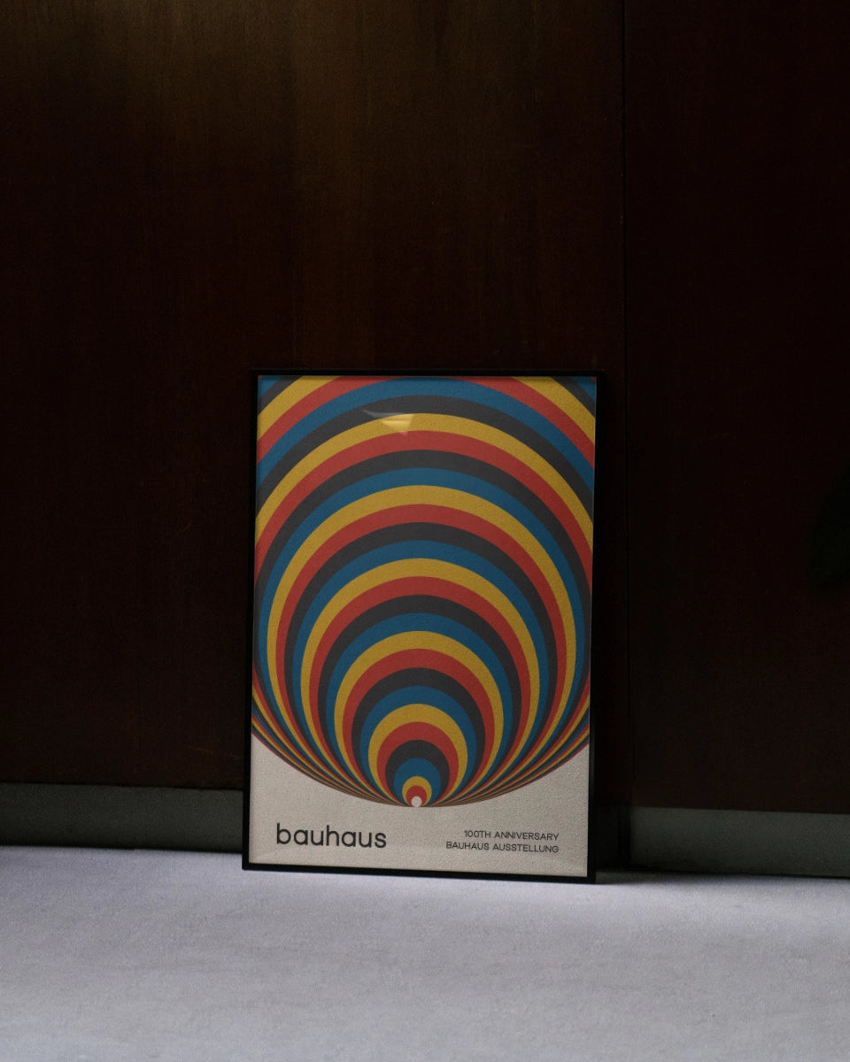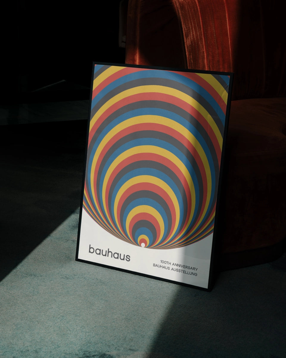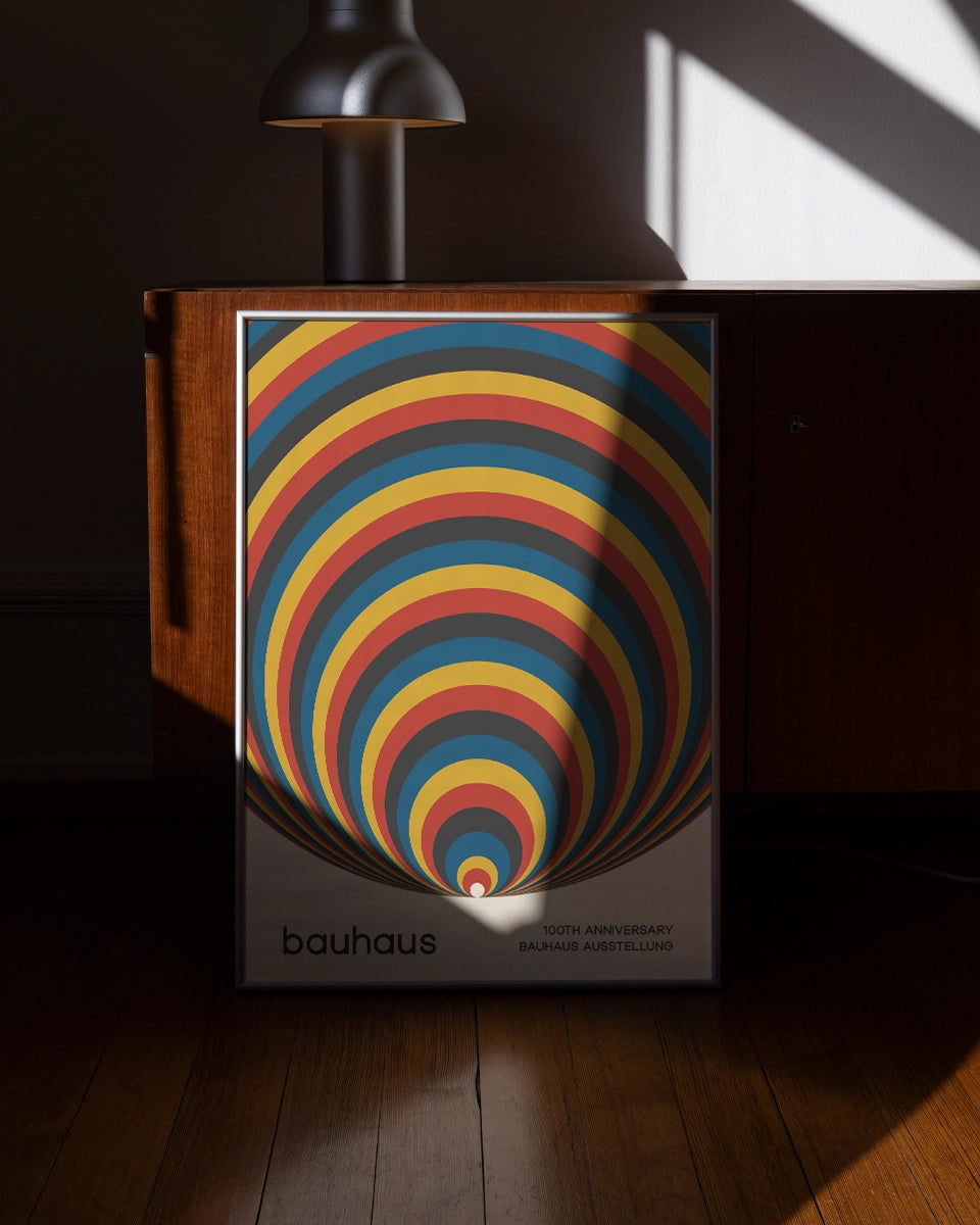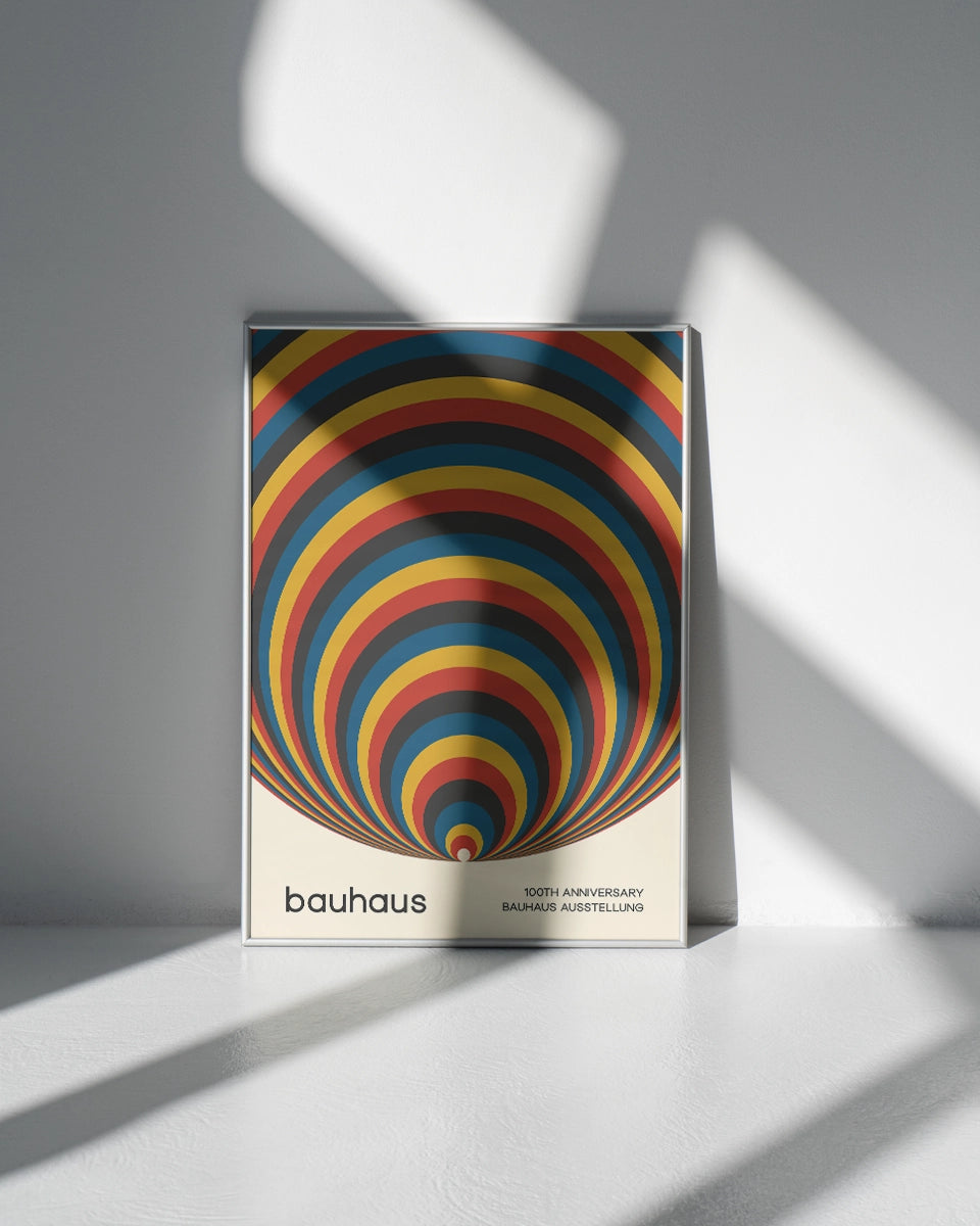 Deze abstracte poster ter viering van het 100-jarig jubileum van de Bauhaus-beweging brengt de essentie van modernistische kunst en architectuur samen in een minimalistisch ontwerp. De achtergrond bestaat uit cirkelvormige strepen in primaire kleuren zoals rood, geel, blauw en zwart, die een visueel dynamisch patroon vormen. De strakke lijnen en de geometrische vormen geven het ontwerp een gevoel van orde en structuur, wat typerend is voor de Bauhaus-stijl. De krachtige kleur contrasten trekken de aandacht en benadrukken de eenvoud en schoonheid van de vormen.