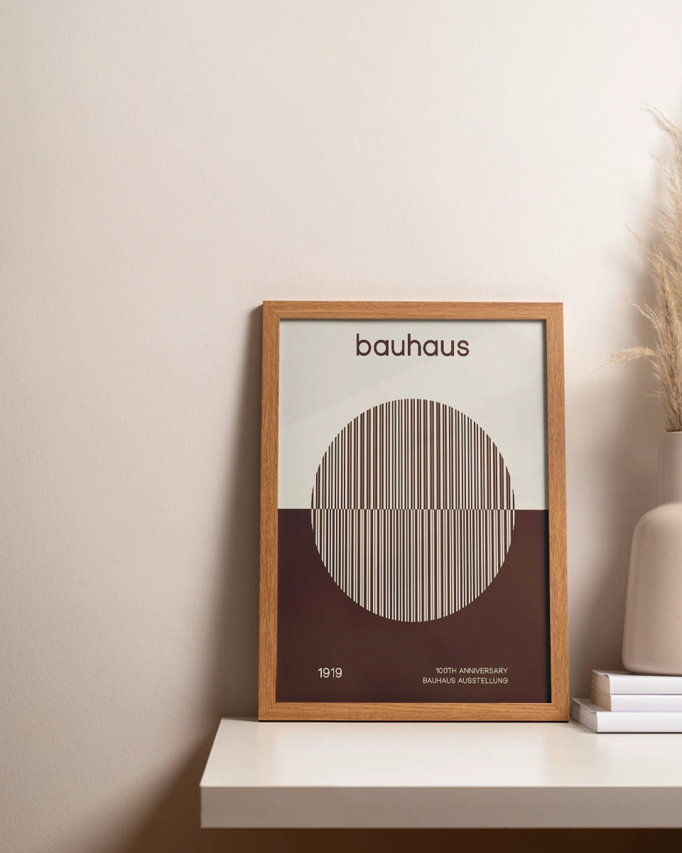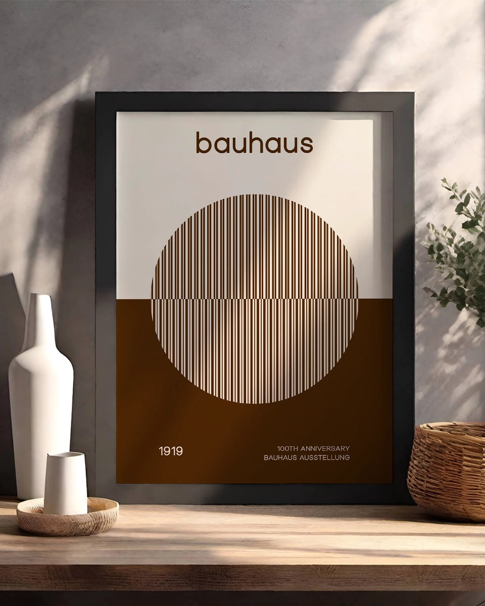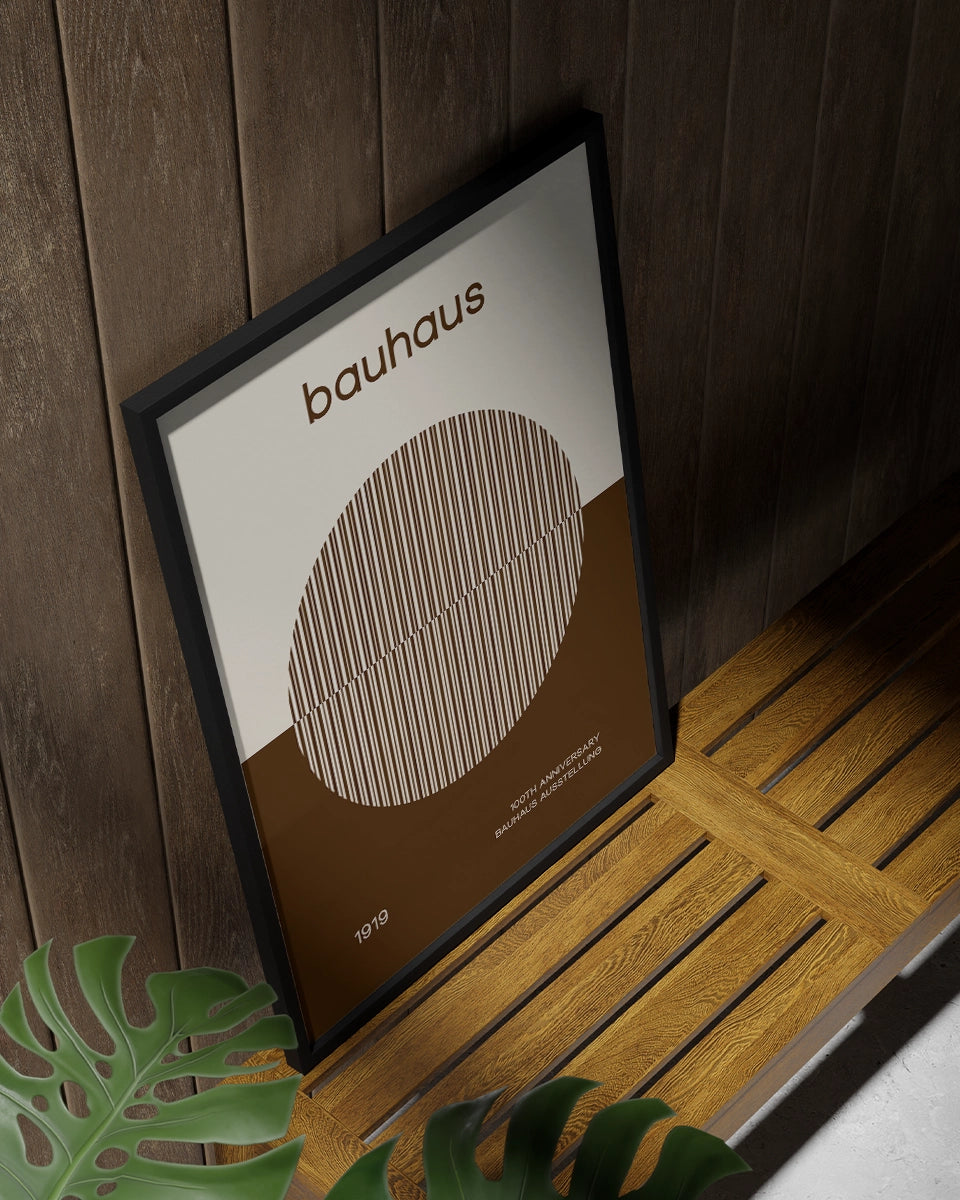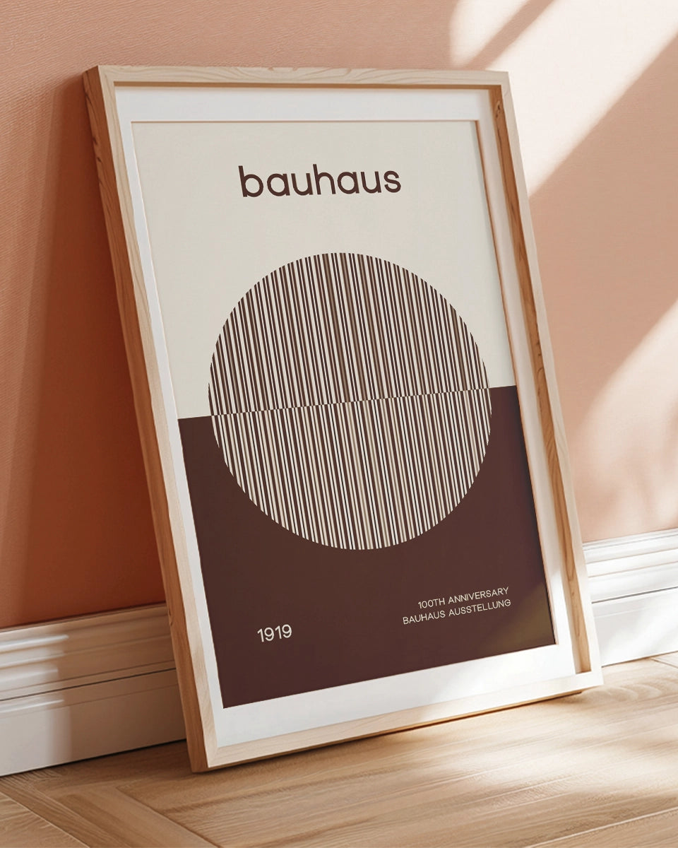 Dit minimalistische posterontwerp is een elegante viering van het 100-jarig jubileum van de Bauhaus-beweging. De tekst "Bauhaus" is prominent gecentreerd op een witte achtergrond, waarbij de eenvoud van het ontwerp de kracht van de woorden benadrukt. Onder de tekst volgt de zin "100th Anniversary", die een vleugje geschiedenis toevoegt aan het ontwerp. Deze tekst is subtiel geplaatst boven een beige cirkel, die is opgebouwd uit verticale lijnen in lichtgrijze en donkere sepia-tinten. Deze combinatie van kleuren en lijnen creëert een visueel rustige en verfijnde uitstraling.