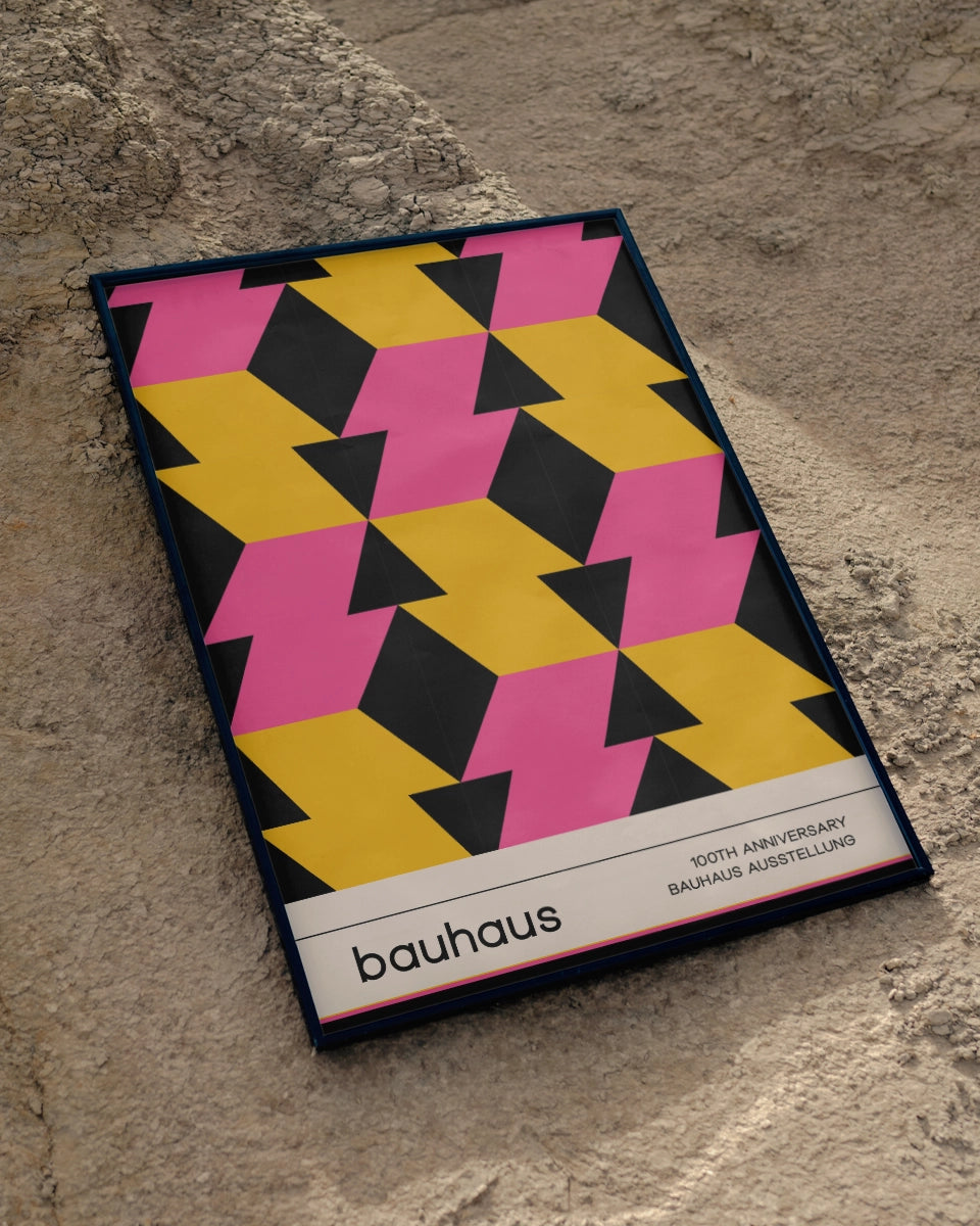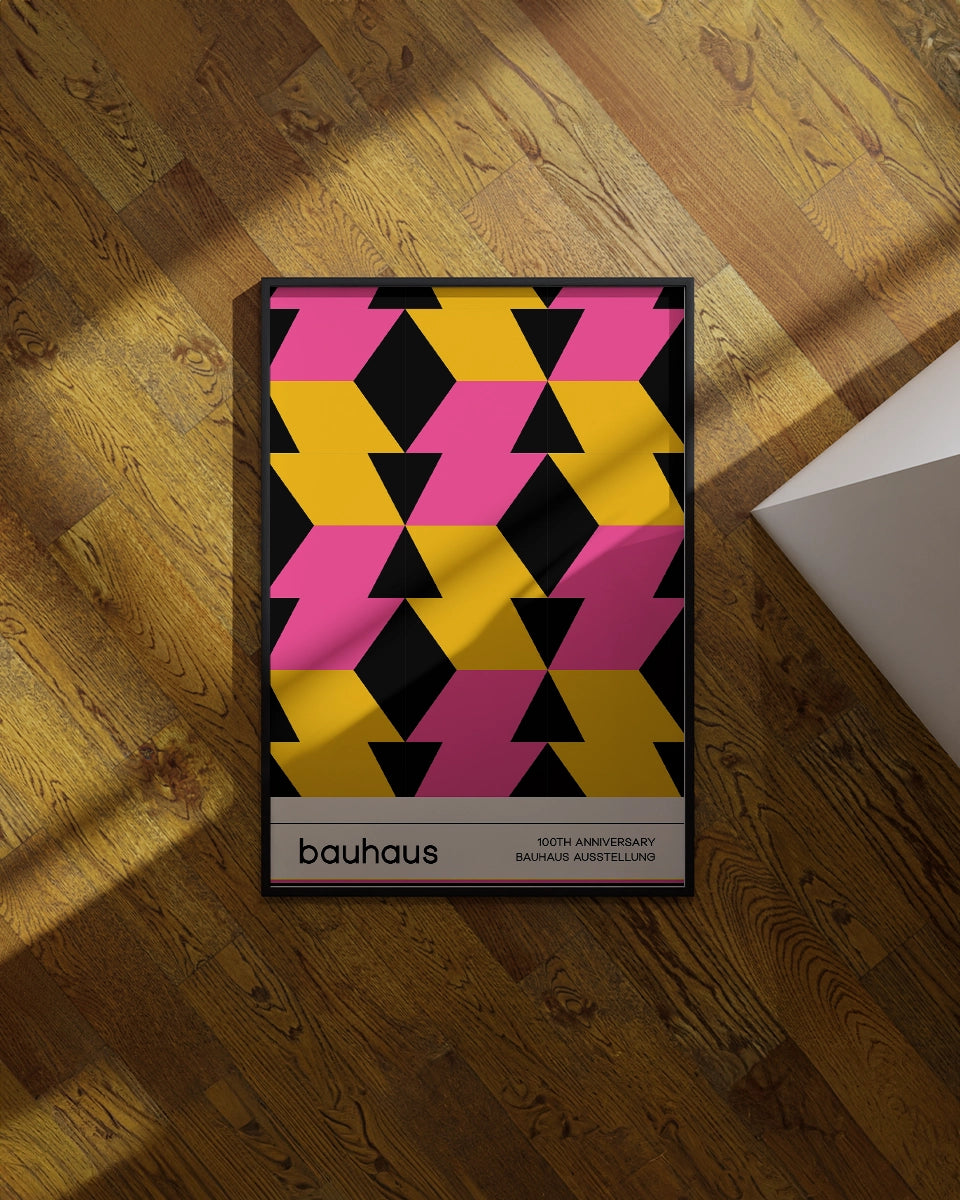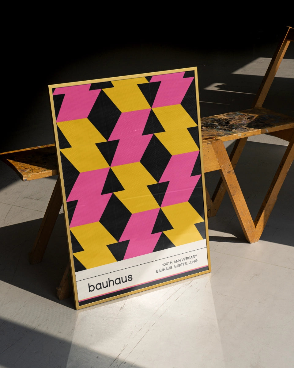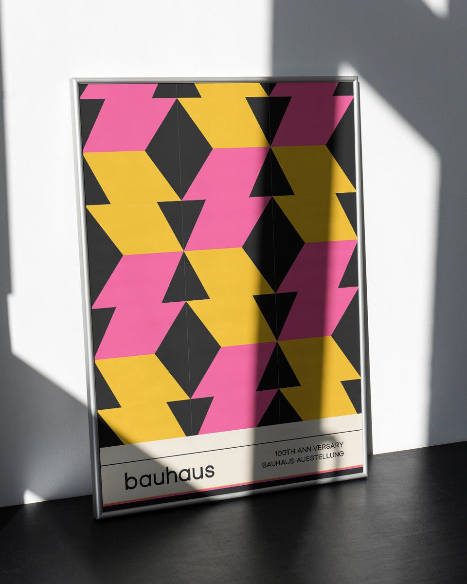 Aan de onderkant van de poster prijkt het woord "Bauhaus" in een strak, zwart lettertype. De ingetogen typografie vormt een perfect evenwicht met de felle kleuren en het gedurfde patroon, waardoor een harmonieuze en minimalistische stijl wordt gecreëerd.