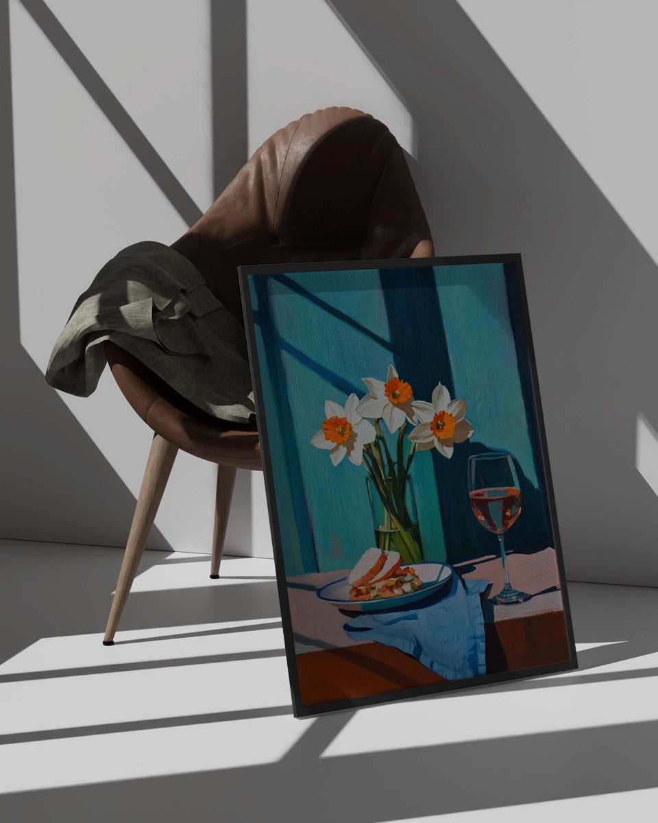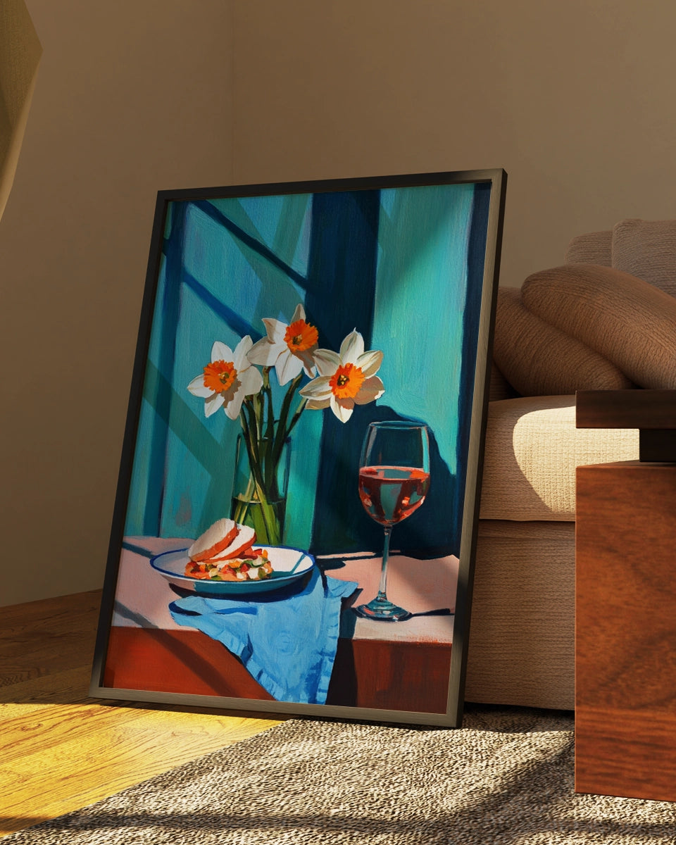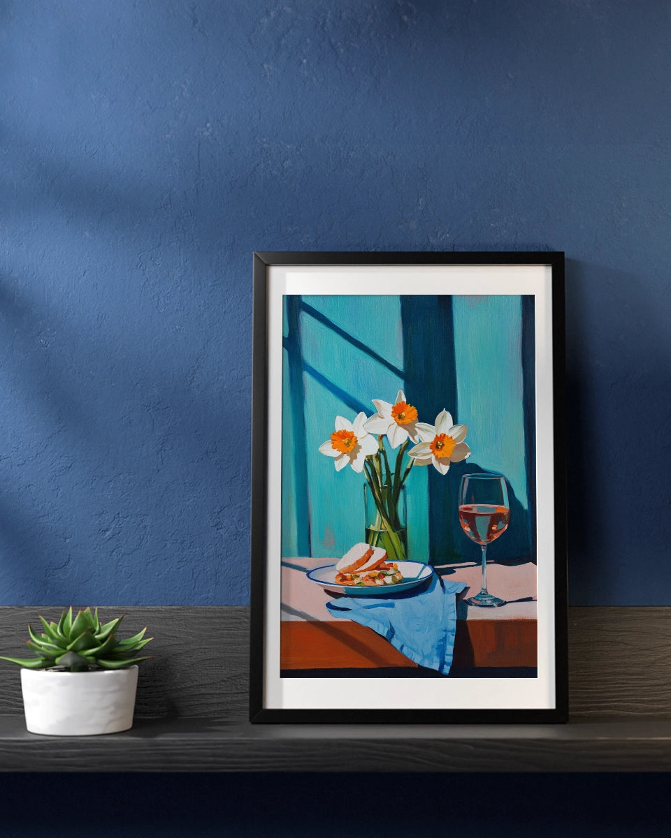 Deze schilderachtige kunstposter biedt een verfijnde en serene weergave van een tafelsetting. Het schilderij toont een bord met een broodje Parmezaanse kaas, zorgvuldig geplaatst naast een glas witte wijn. Het beeld wordt verrijkt door de aanwezigheid van een bosje narcissen, dat een levendig geel accent toevoegt aan de scene. De tafel is bedekt met een blauw tafelkleed, dat op een elegante manier contrasteert met de zachte kleuren van de bloemen en de kaas.