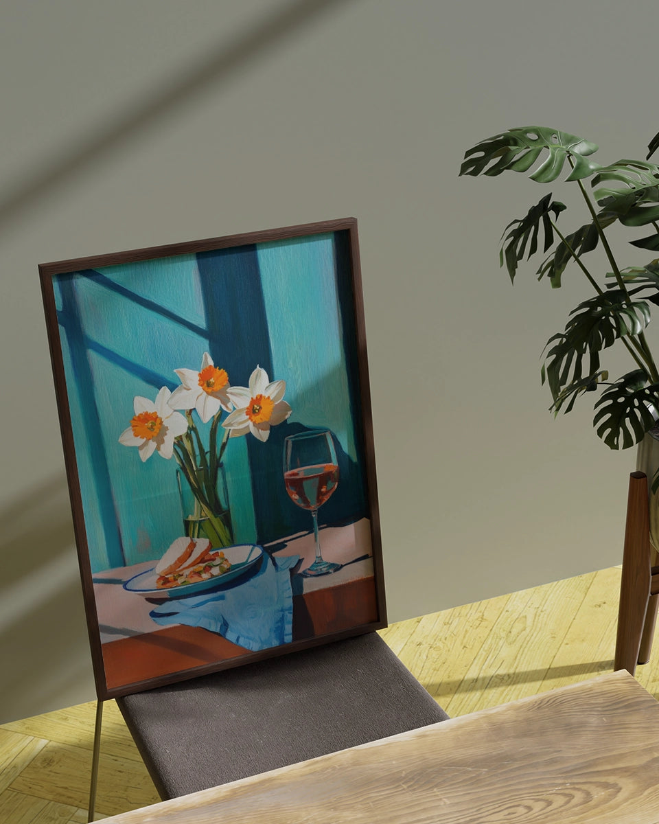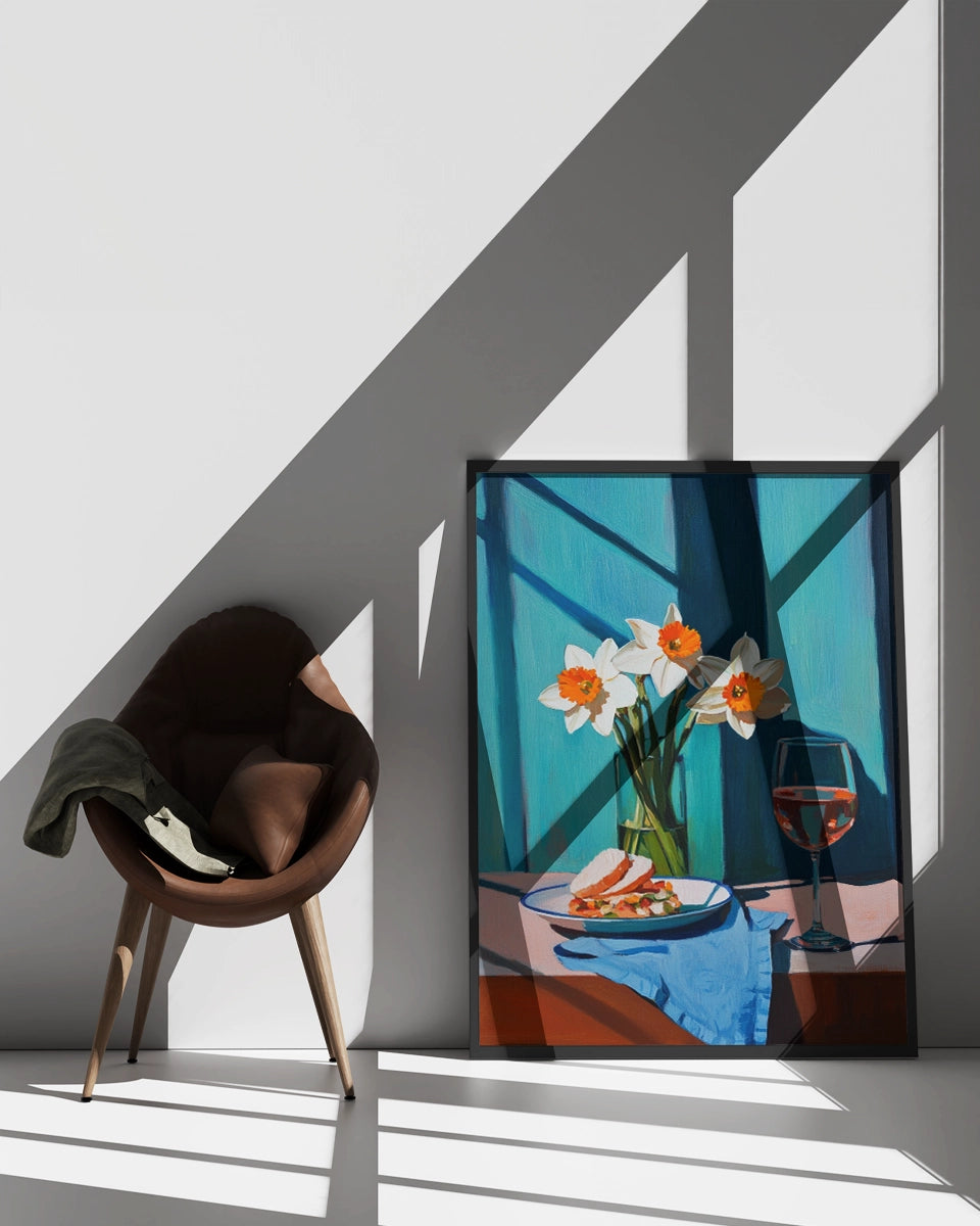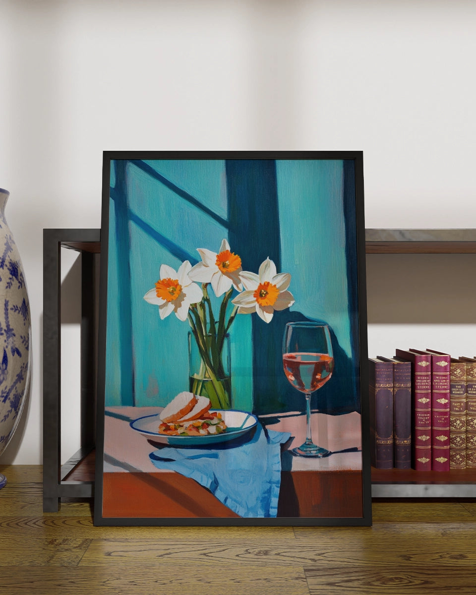 Deze schilderachtige kunstposter biedt een verfijnde en serene weergave van een tafelsetting. Het schilderij toont een bord met een broodje Parmezaanse kaas, zorgvuldig geplaatst naast een glas witte wijn. Het beeld wordt verrijkt door de aanwezigheid van een bosje narcissen, dat een levendig geel accent toevoegt aan de scene. De tafel is bedekt met een blauw tafelkleed, dat op een elegante manier contrasteert met de zachte kleuren van de bloemen en de kaas.