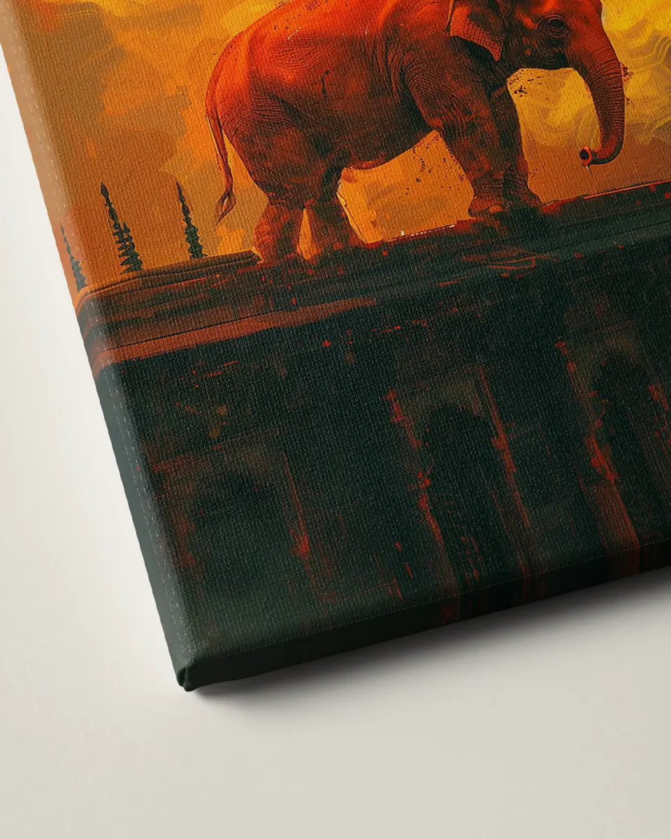 De diepe, donkere tinten vormen een contrast met het levendige oranje en geel, waardoor de olifant als een stralend baken van kracht en vastberadenheid naar voren komt. Het clair-obscur schetsen creëert een dramatisch spel van licht en schaduw, terwijl de expressieve lijnen van het karakterontwerp de persoonlijkheid van de olifant tot leven brengen.