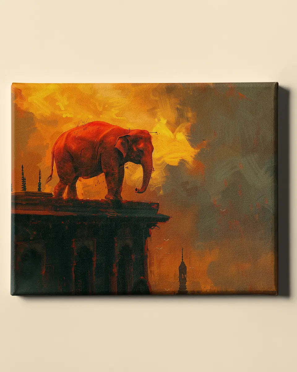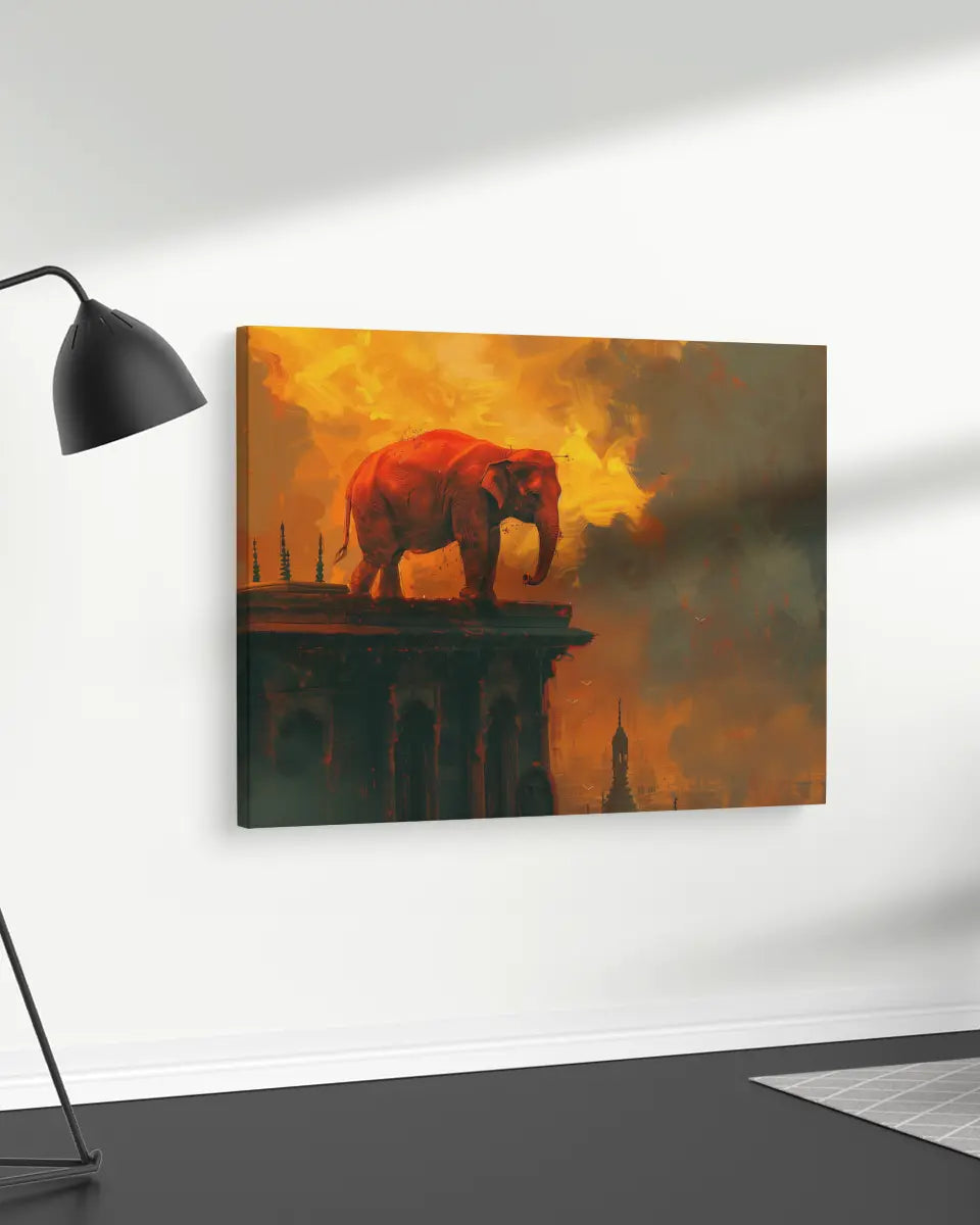 Stap binnen in een wereld van verbeelding en avontuur met dit intrigerende schilderij van een oranje olifant die statig op een gebouw staat, uitgevoerd in een unieke mix van stijlen.
