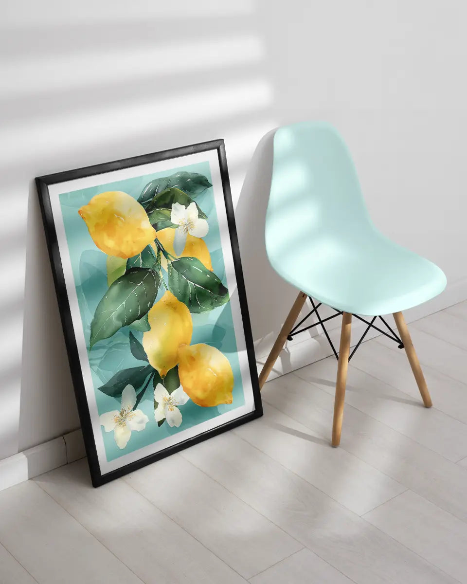 De poster is ontworpen in een verfijnde aquarelstijl die rijk is aan details. Elke citroen en citroenbloesem is met zorg en precisie geïllustreerd om de schoonheid en complexiteit van deze vruchten en bloemen tot leven te brengen. De heldere kleuren van de citroenen en het delicate wit van de citroenbloesems contrasteren prachtig met de lichtblauwe achtergrond, waardoor een harmonieus en oogstrelend geheel ontstaat.