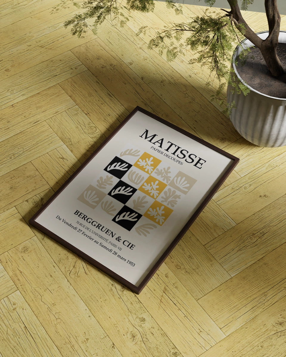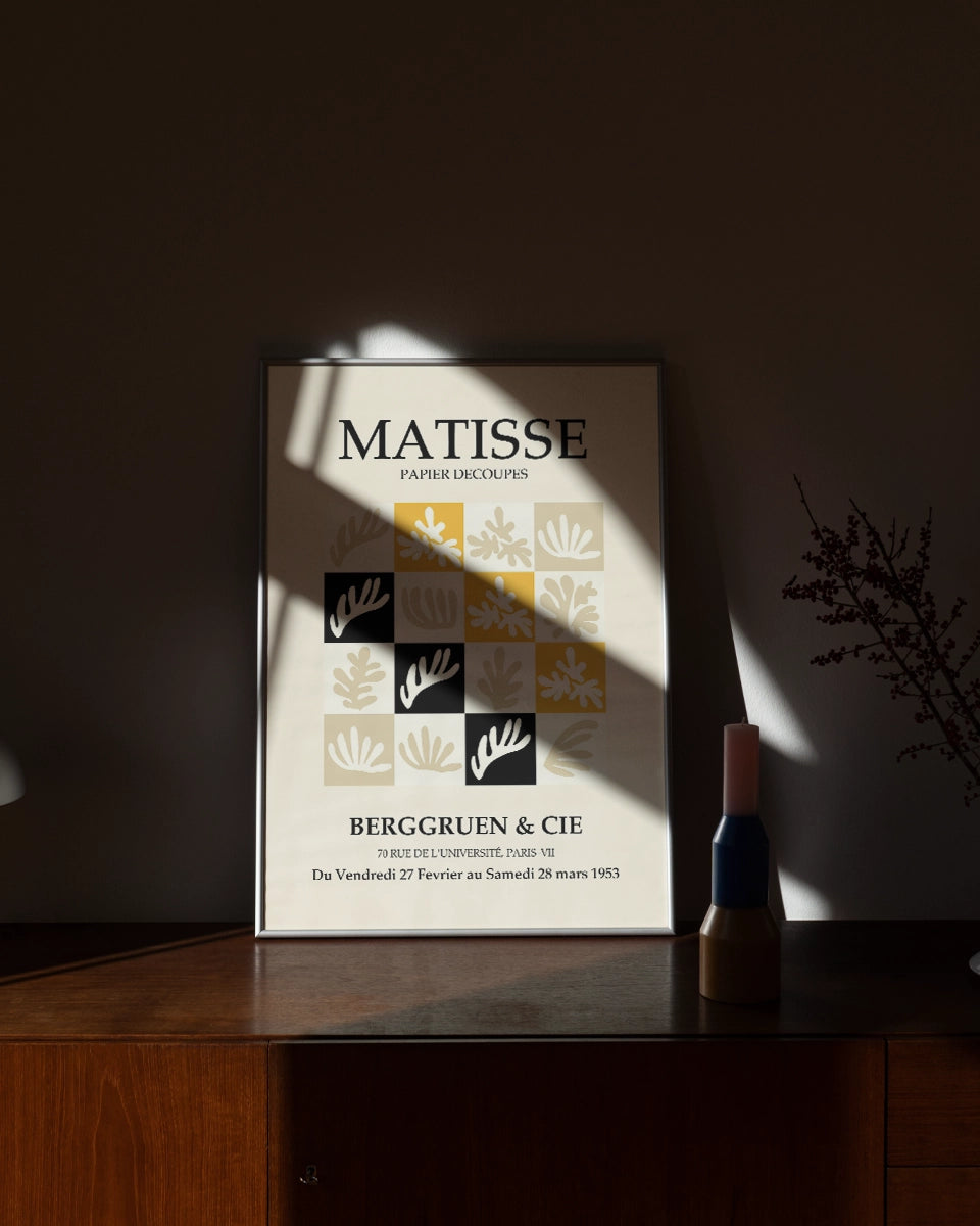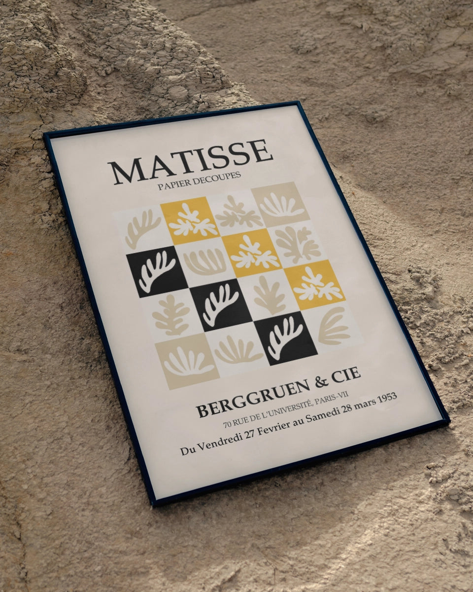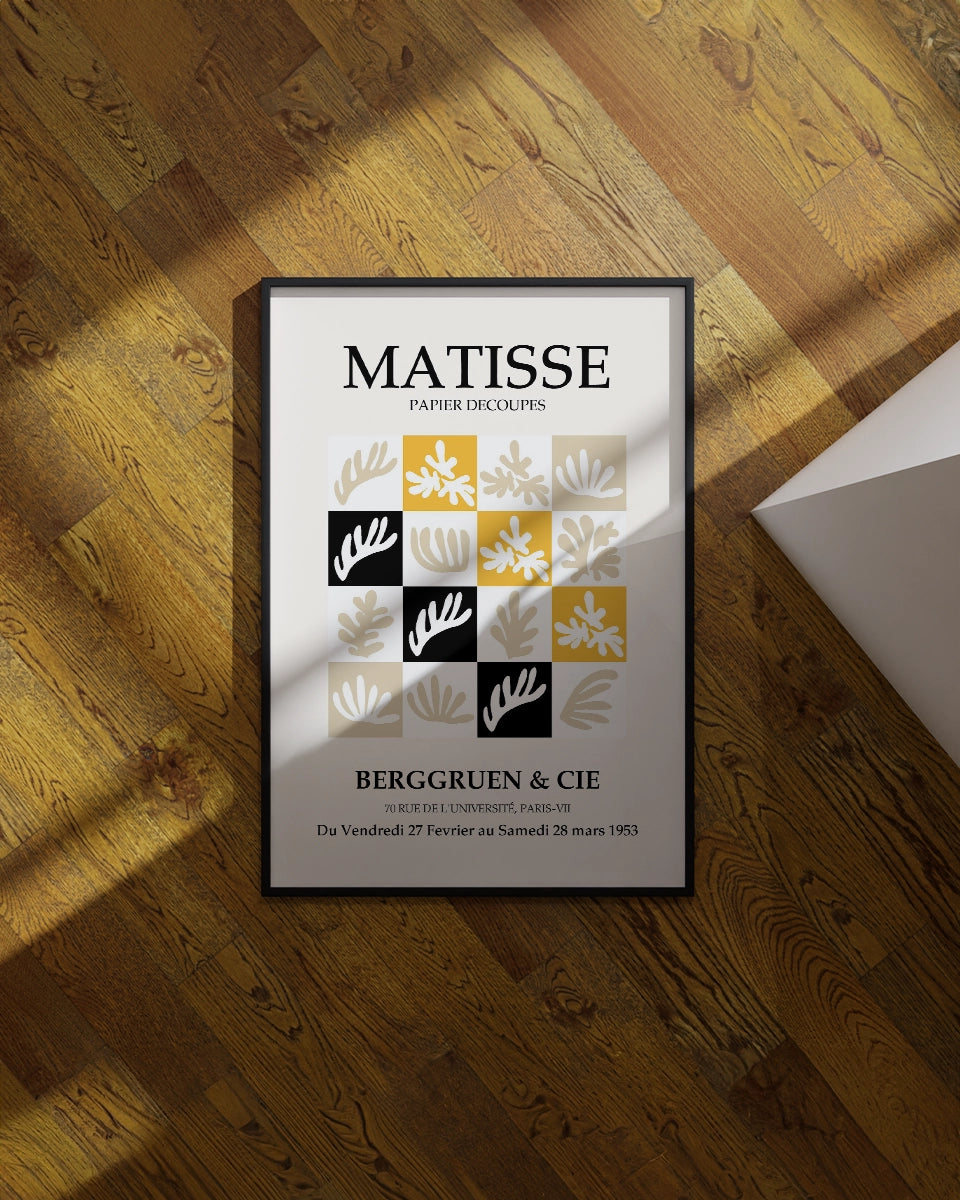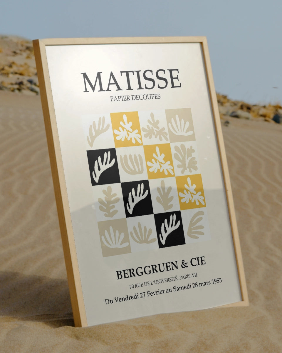Het algehele ontwerp combineert typografie en geometrie om een poster te creëren die zowel modern als tijdloos is. Perfect voor liefhebbers van minimalistische kunst, moderne designesthetiek en natuurlijk de iconische stijl van Matisse.