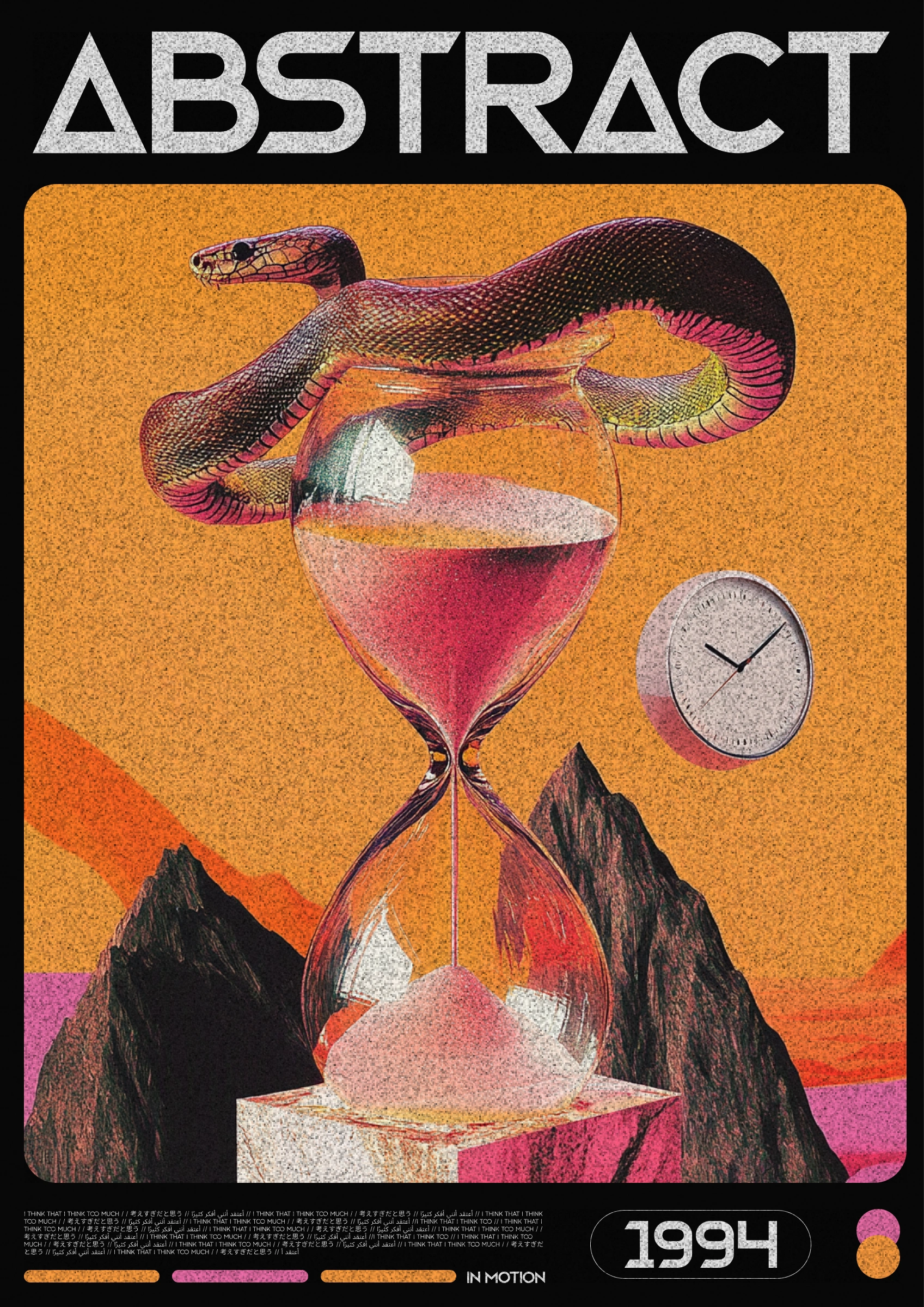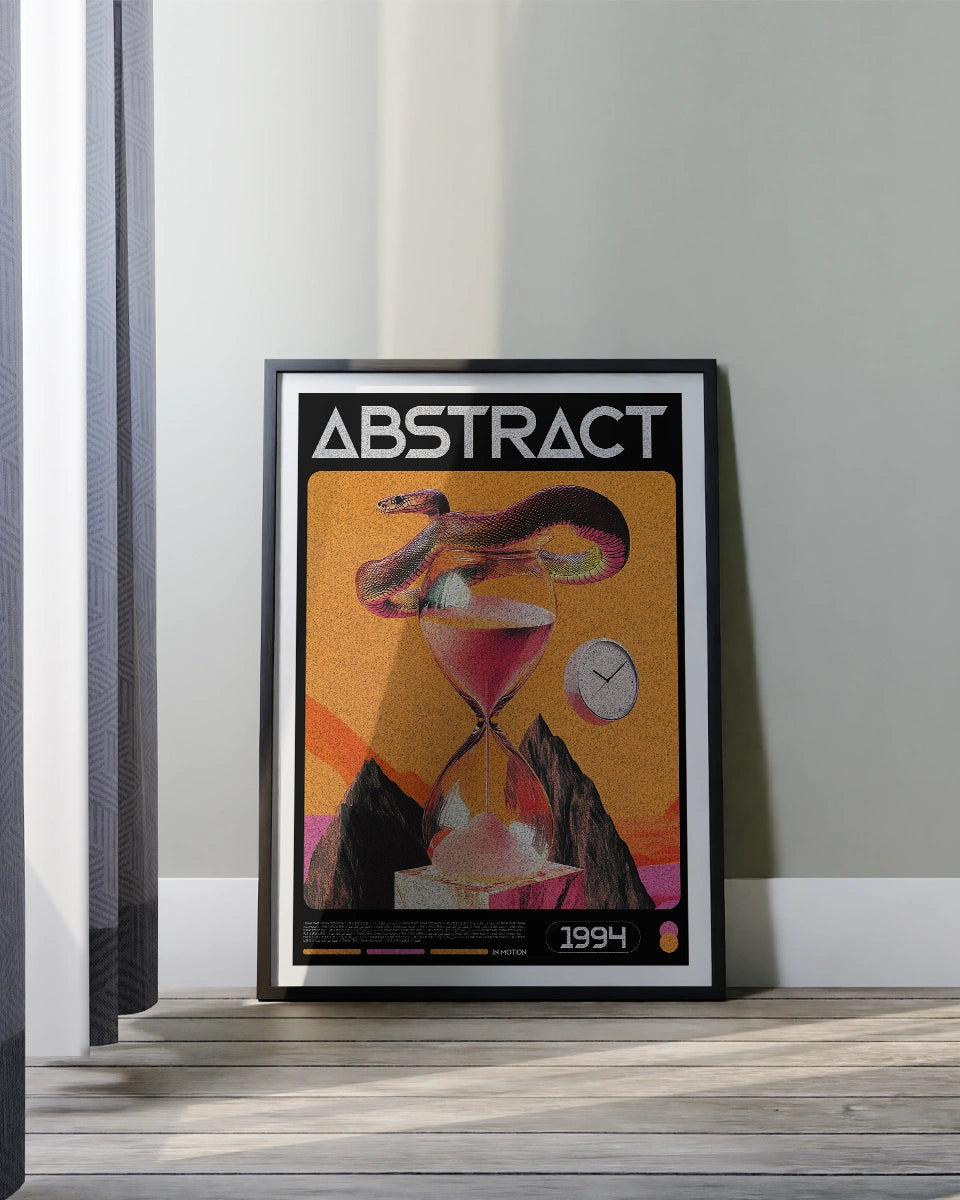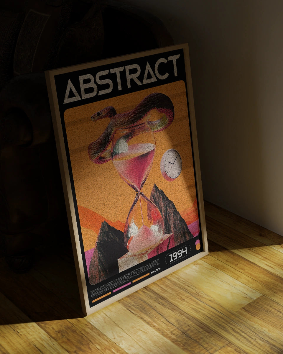 Centraal in de poster staat een zandloper gevuld met levendig roze zand. De zandloper, een symbool van tijd en beweging, wordt op een intrigerende manier omhuld door een slangenmotief, dat een gevoel van mysterie en dynamiek toevoegt aan het ontwerp. Bovenaan de poster prijkt de tekst “ABSTRACT in Motion” in een stijl die de retro esthetiek versterkt, met een subtiele knipoog naar klassieke typografie.