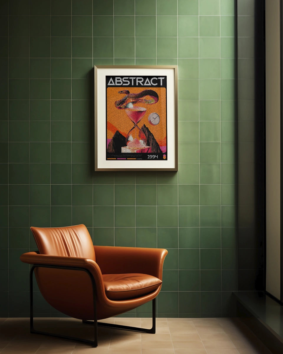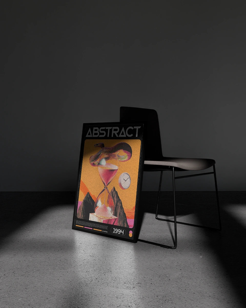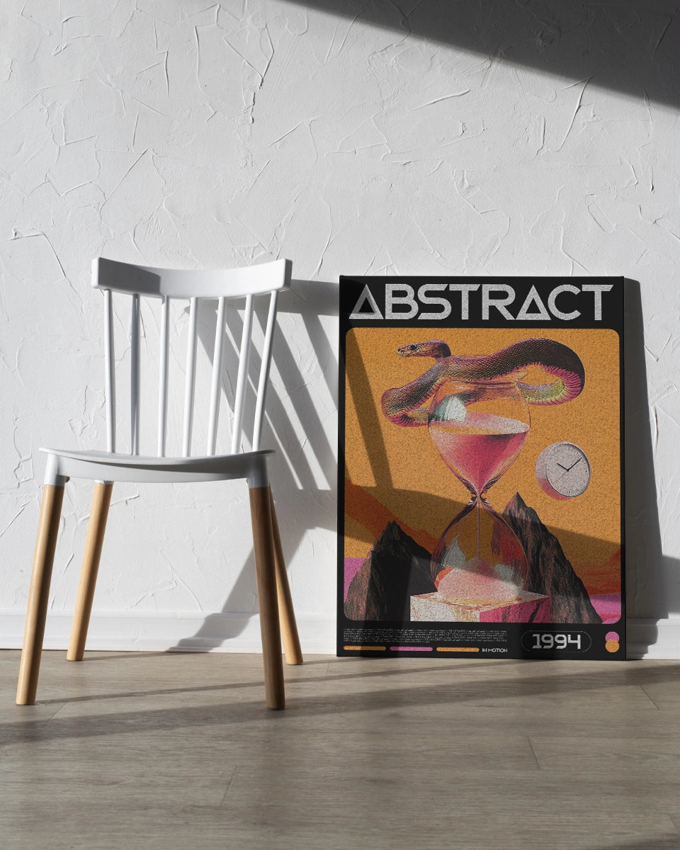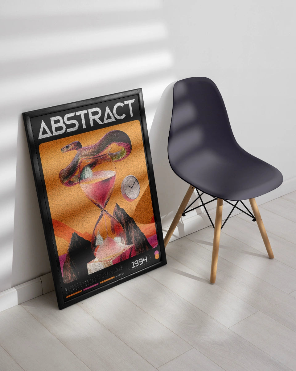 Centraal in de poster staat een zandloper gevuld met levendig roze zand. De zandloper, een symbool van tijd en beweging, wordt op een intrigerende manier omhuld door een slangenmotief, dat een gevoel van mysterie en dynamiek toevoegt aan het ontwerp. Bovenaan de poster prijkt de tekst “ABSTRACT in Motion” in een stijl die de retro esthetiek versterkt, met een subtiele knipoog naar klassieke typografie.