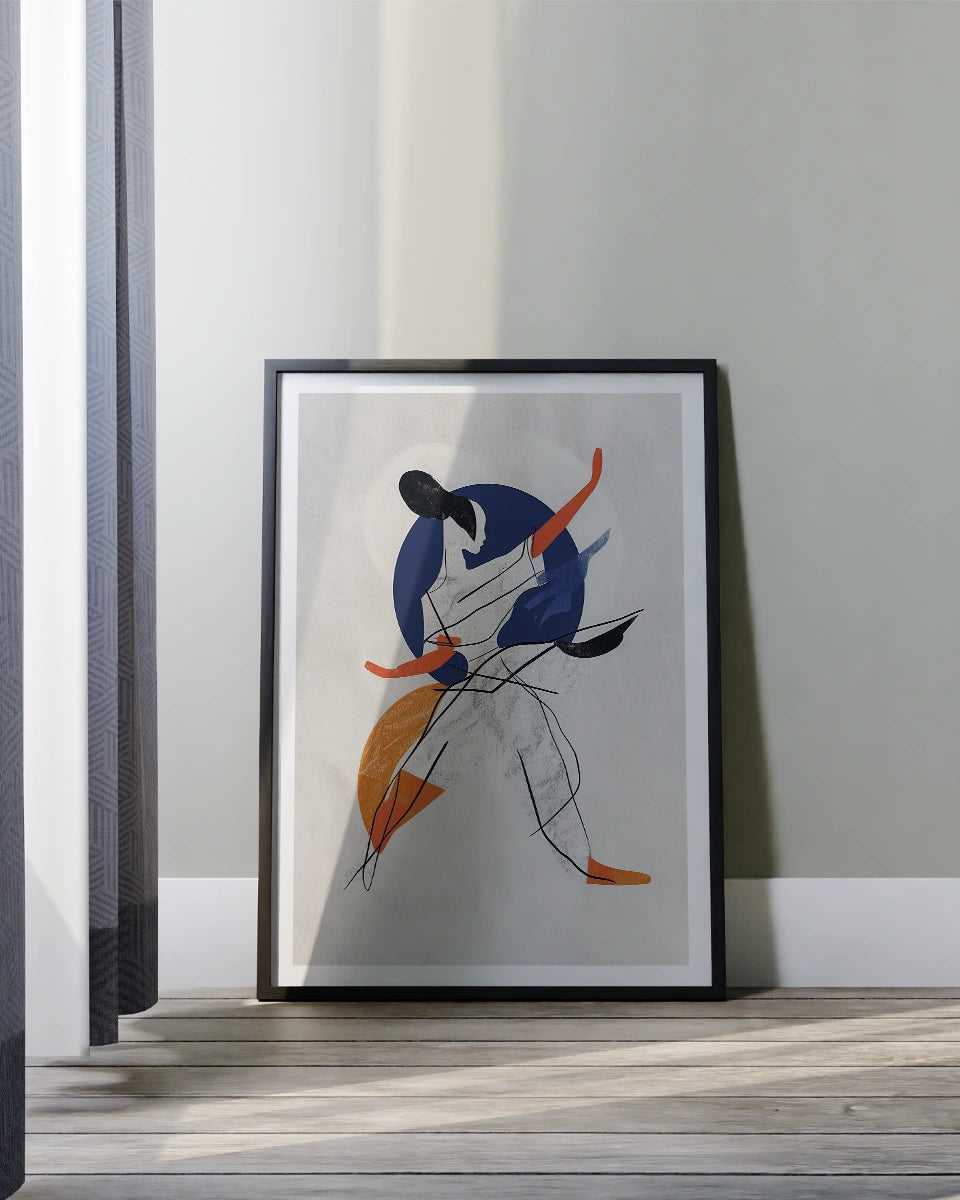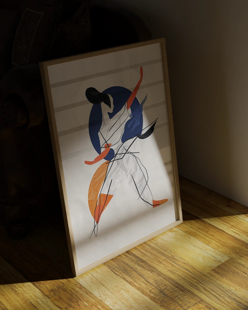De poster is ontworpen met een strakke en moderne esthetiek, gebruikmakend van een gedurfd kleurenpalet dat marineblauw, wit, oranje en lichtgrijs omvat. Deze kleurencombinatie creëert een hoog contrast tegen de effen achtergrond, waardoor de dansende figuur nog meer opvalt. De gebruik van platte illustratie en minimalistische lijntekeningen benadrukt de essentie van hiphopdans zonder afleiding, wat resulteert in een krachtig en visueel aantrekkelijke compositie.
