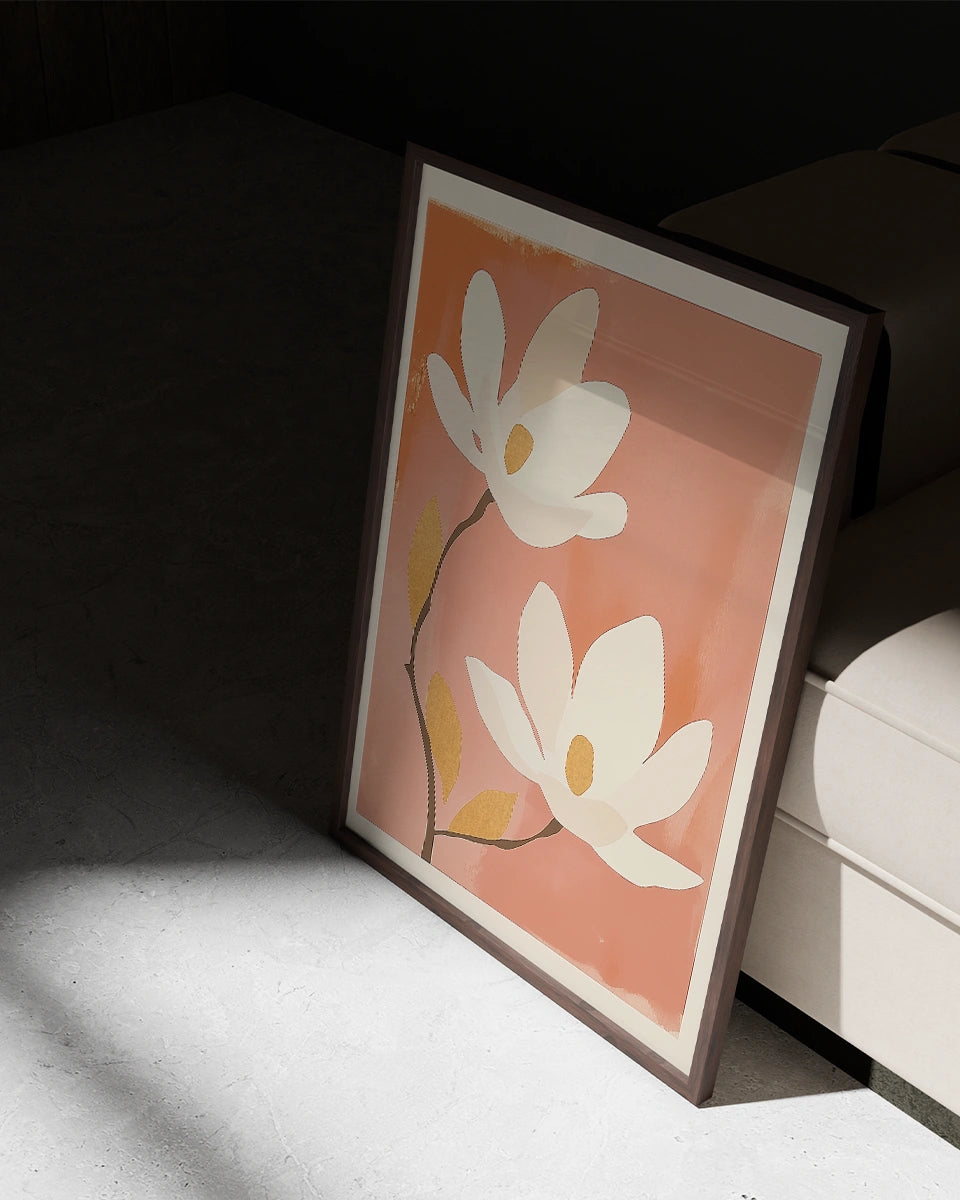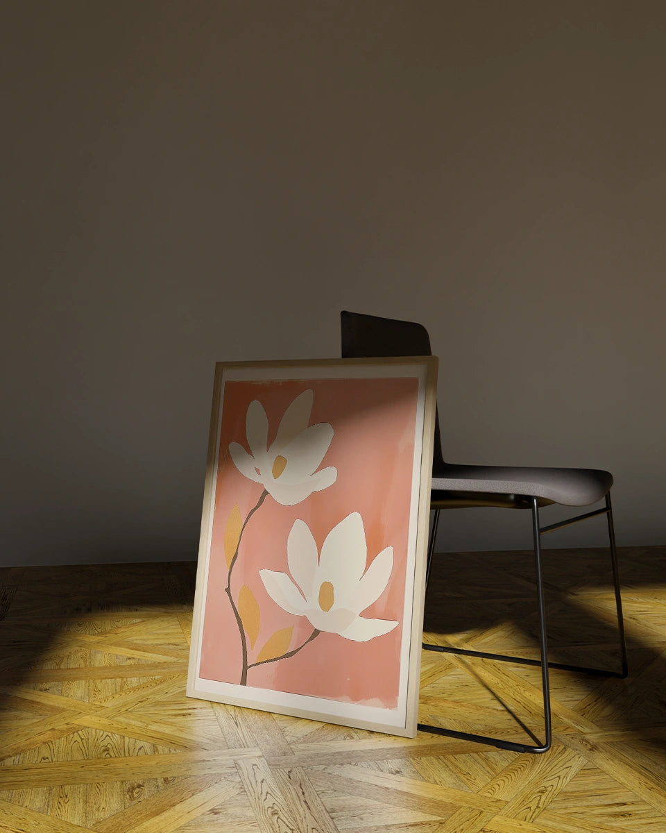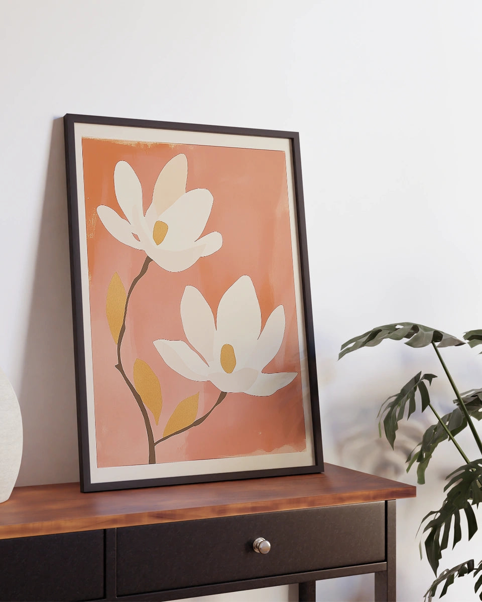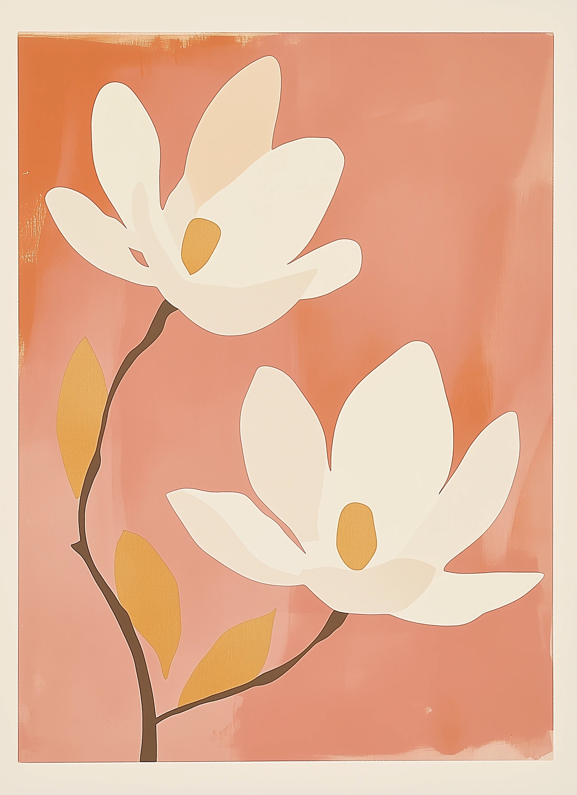 Breng een frisse en verfijnde uitstraling naar je interieur met onze flat illustration poster van magnolia bloemen, geïnspireerd door de stijl van Henri Matisse. Dit kunstwerk vangt de schoonheid van twee witte magnolia bloemen die elegant zijn afgebeeld op een warme oranje-roze achtergrond, met opvallende gele bladeren en lange stelen die de compositie tot leven brengen.