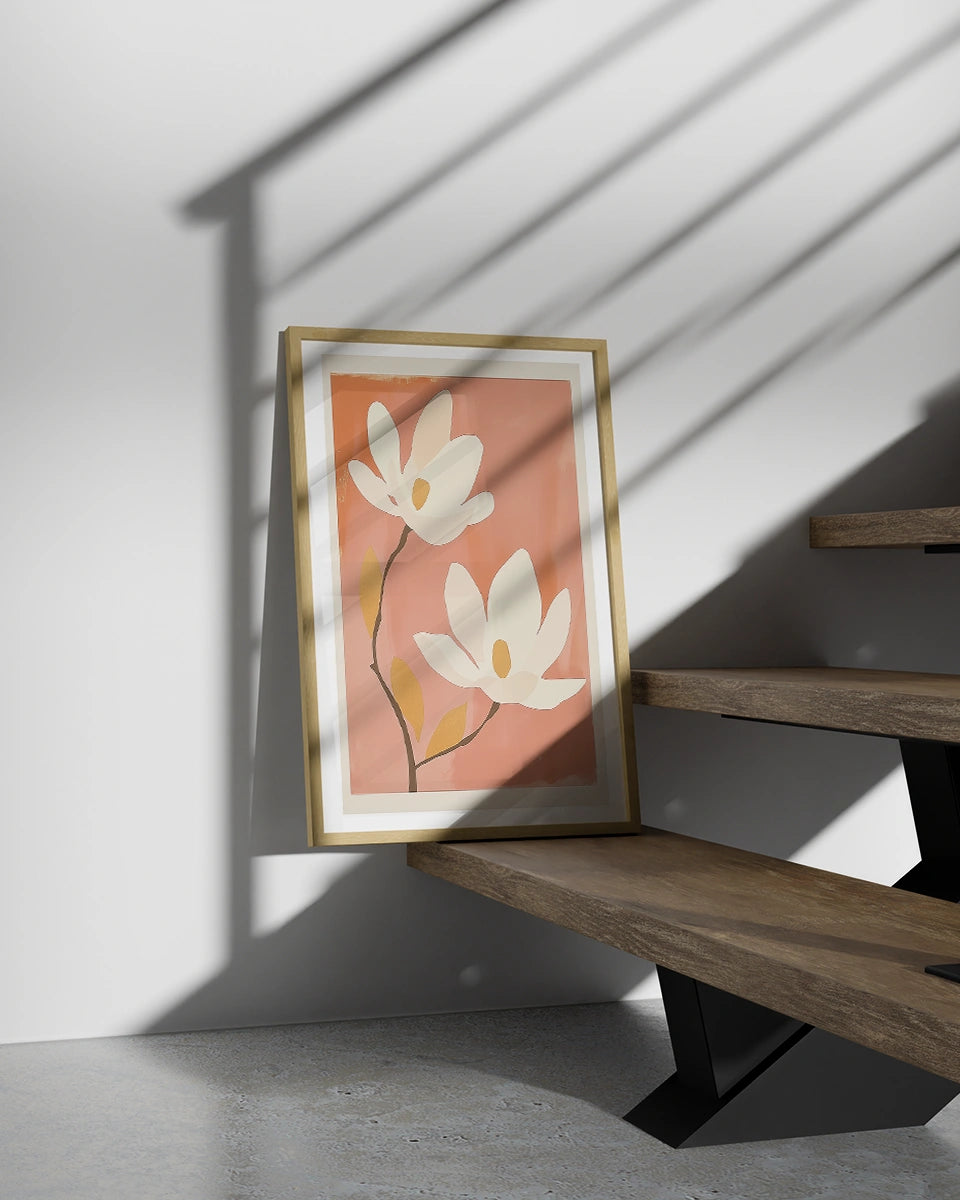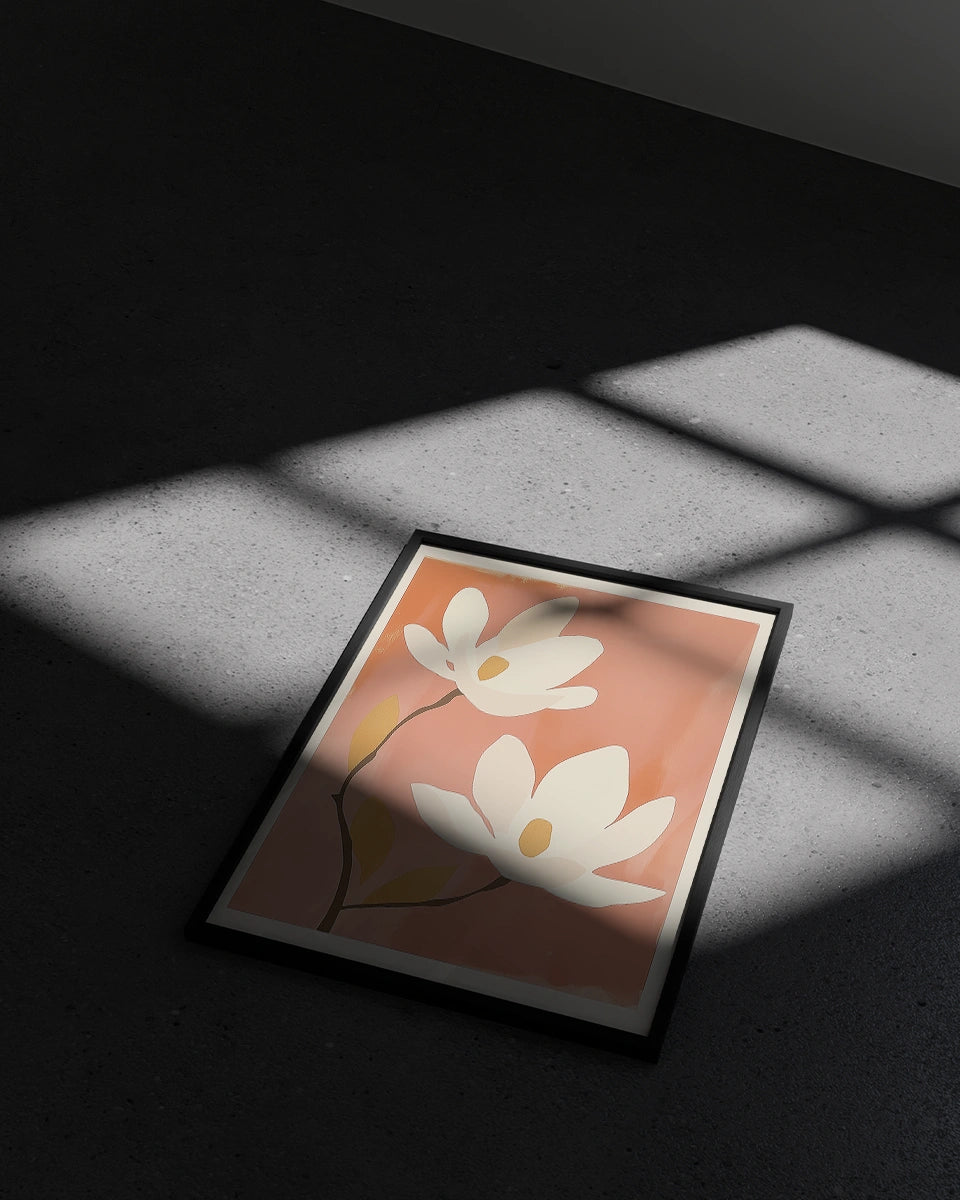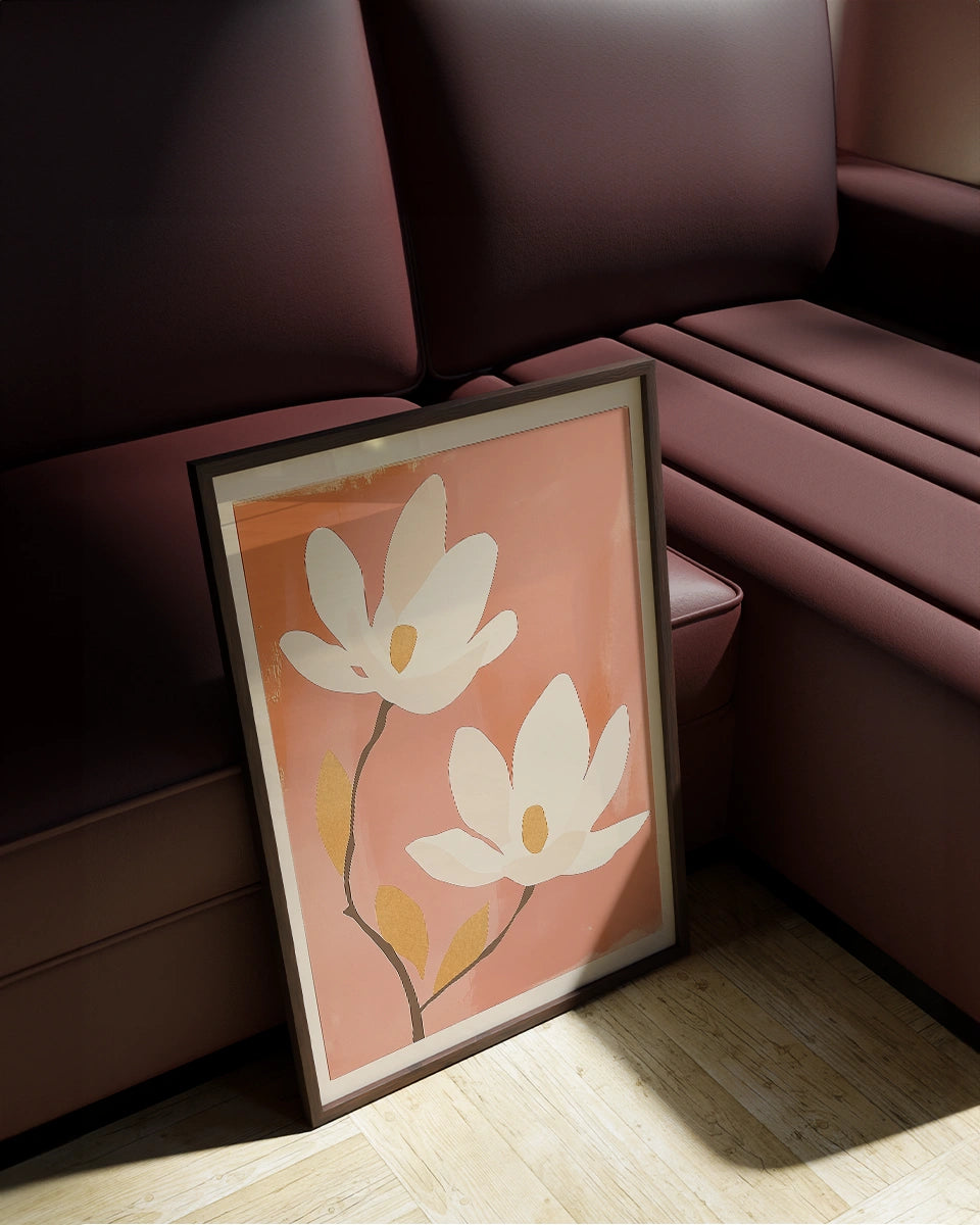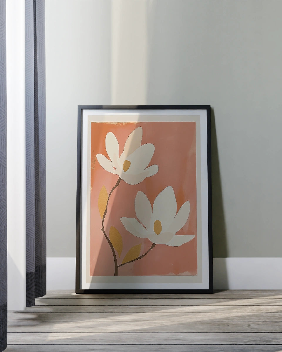 Breng een frisse en verfijnde uitstraling naar je interieur met onze flat illustration poster van magnolia bloemen, geïnspireerd door de stijl van Henri Matisse. Dit kunstwerk vangt de schoonheid van twee witte magnolia bloemen die elegant zijn afgebeeld op een warme oranje-roze achtergrond, met opvallende gele bladeren en lange stelen die de compositie tot leven brengen.