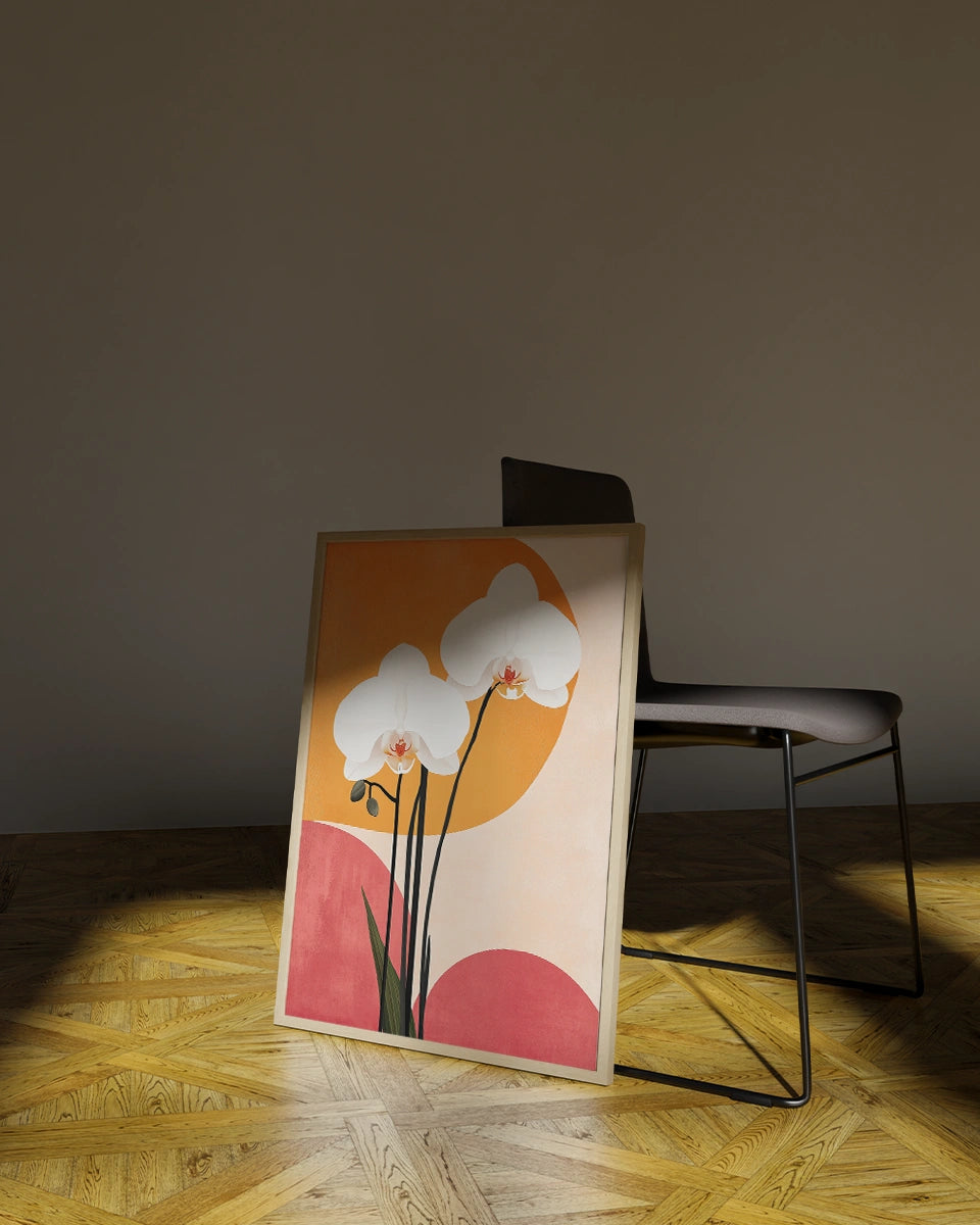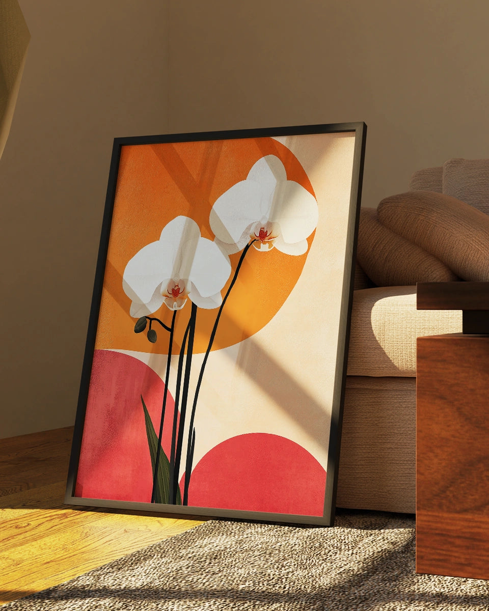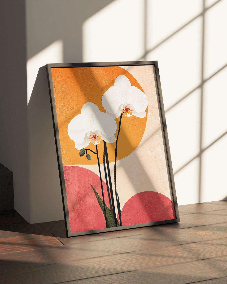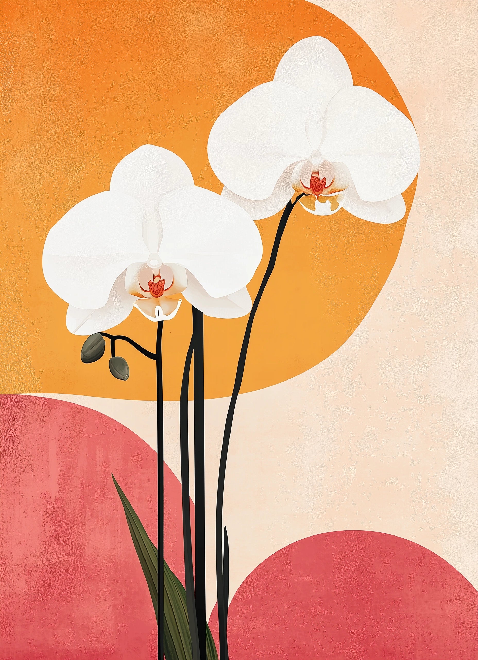 Poster - Minimalistische Illustratie - Twee Witte Orchideeën - Oranje en Roze Achtergrond - Zonnestralen