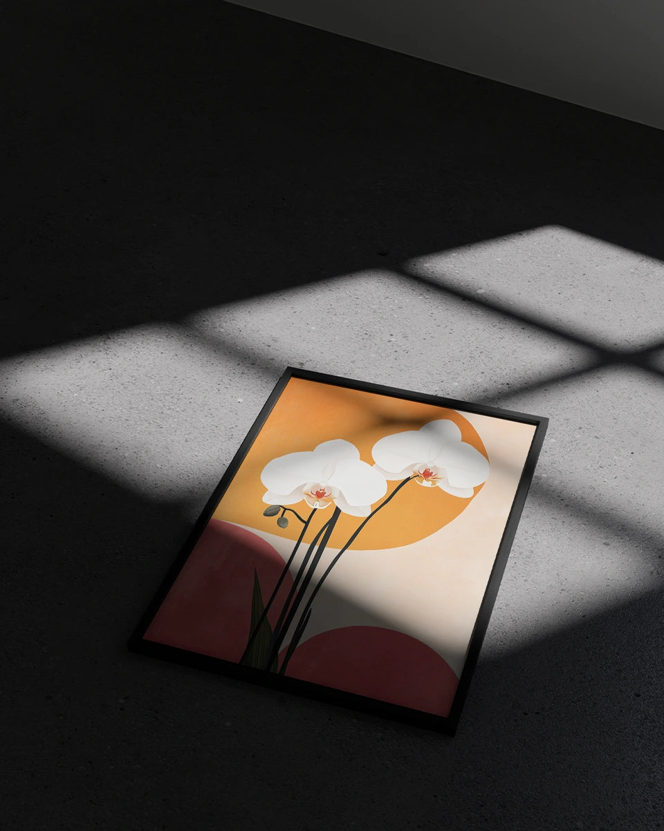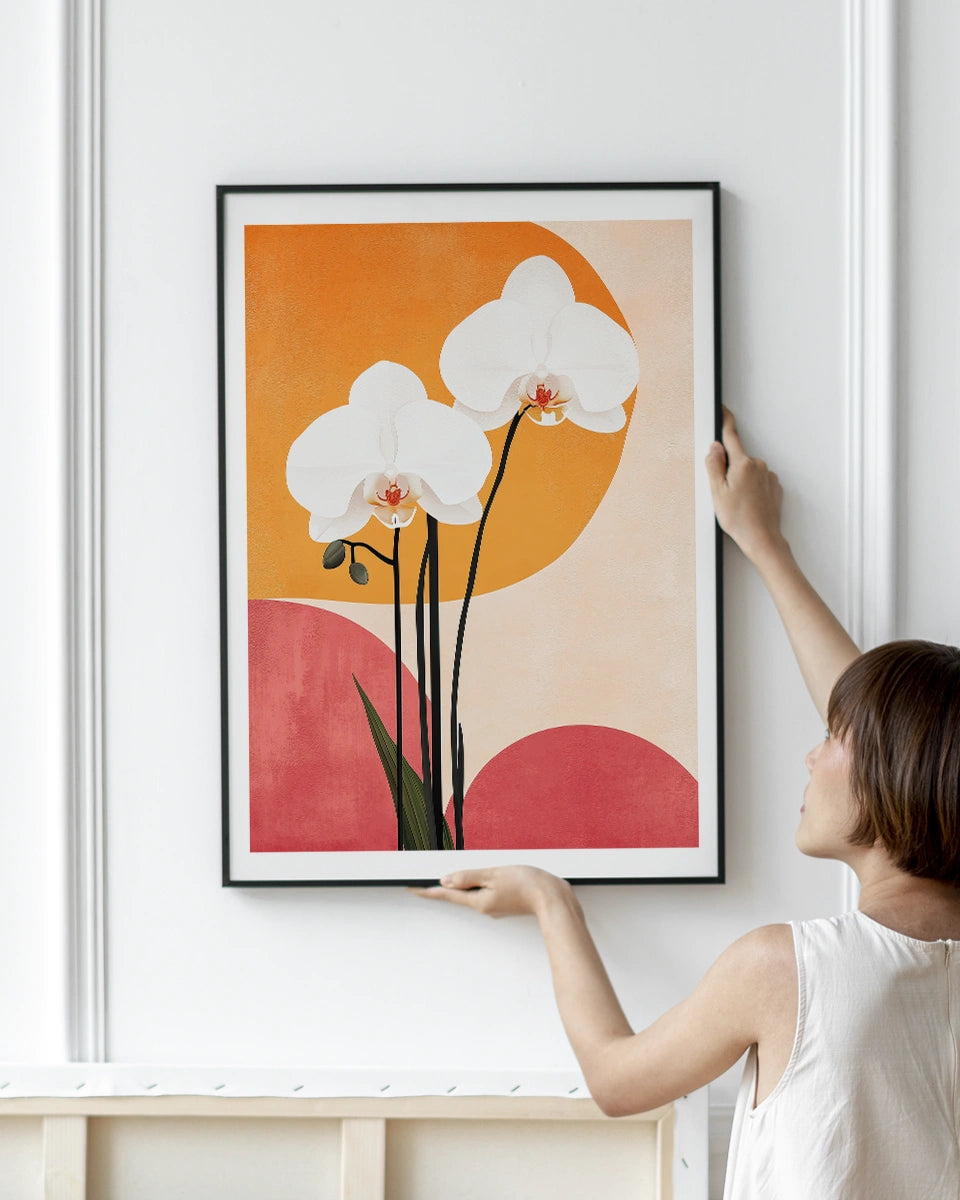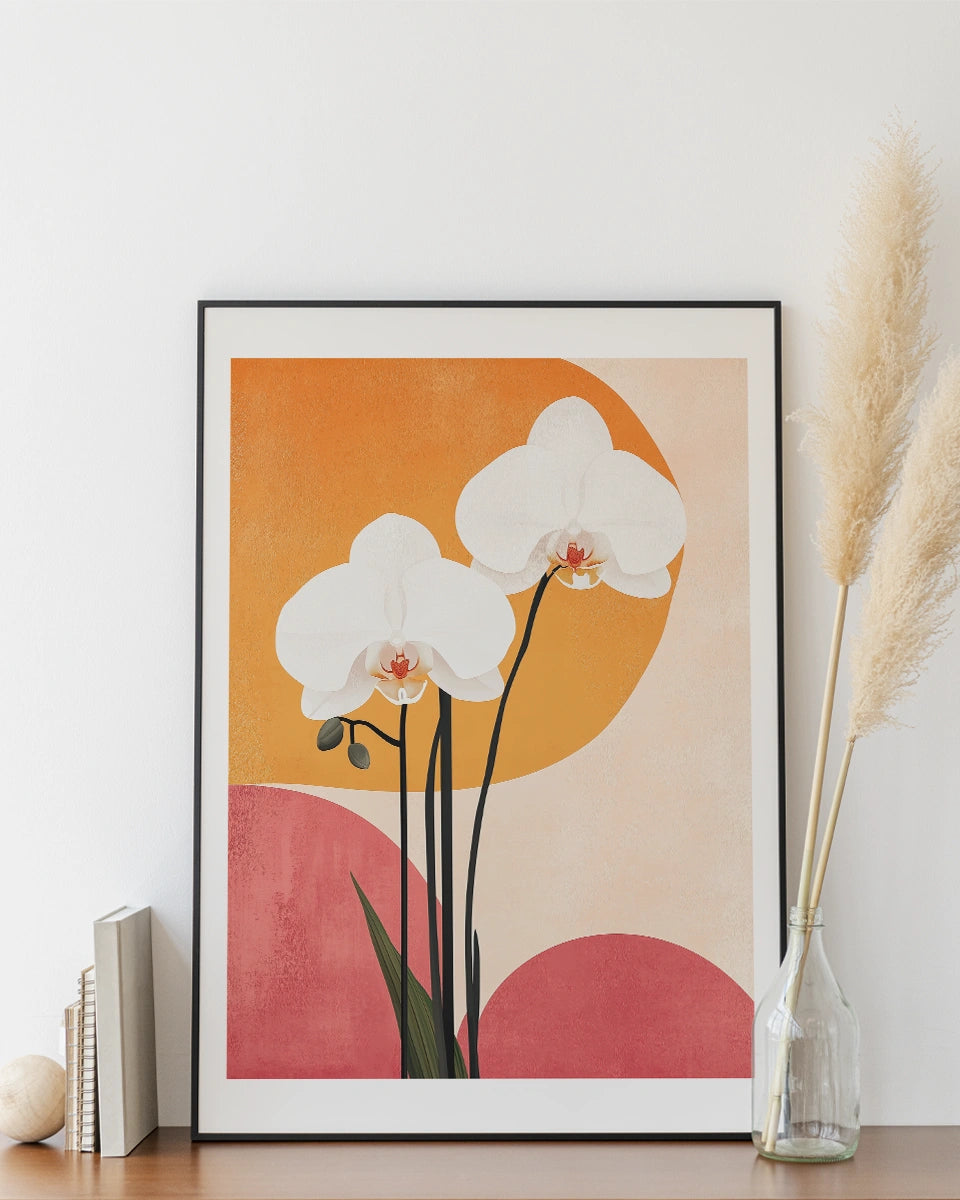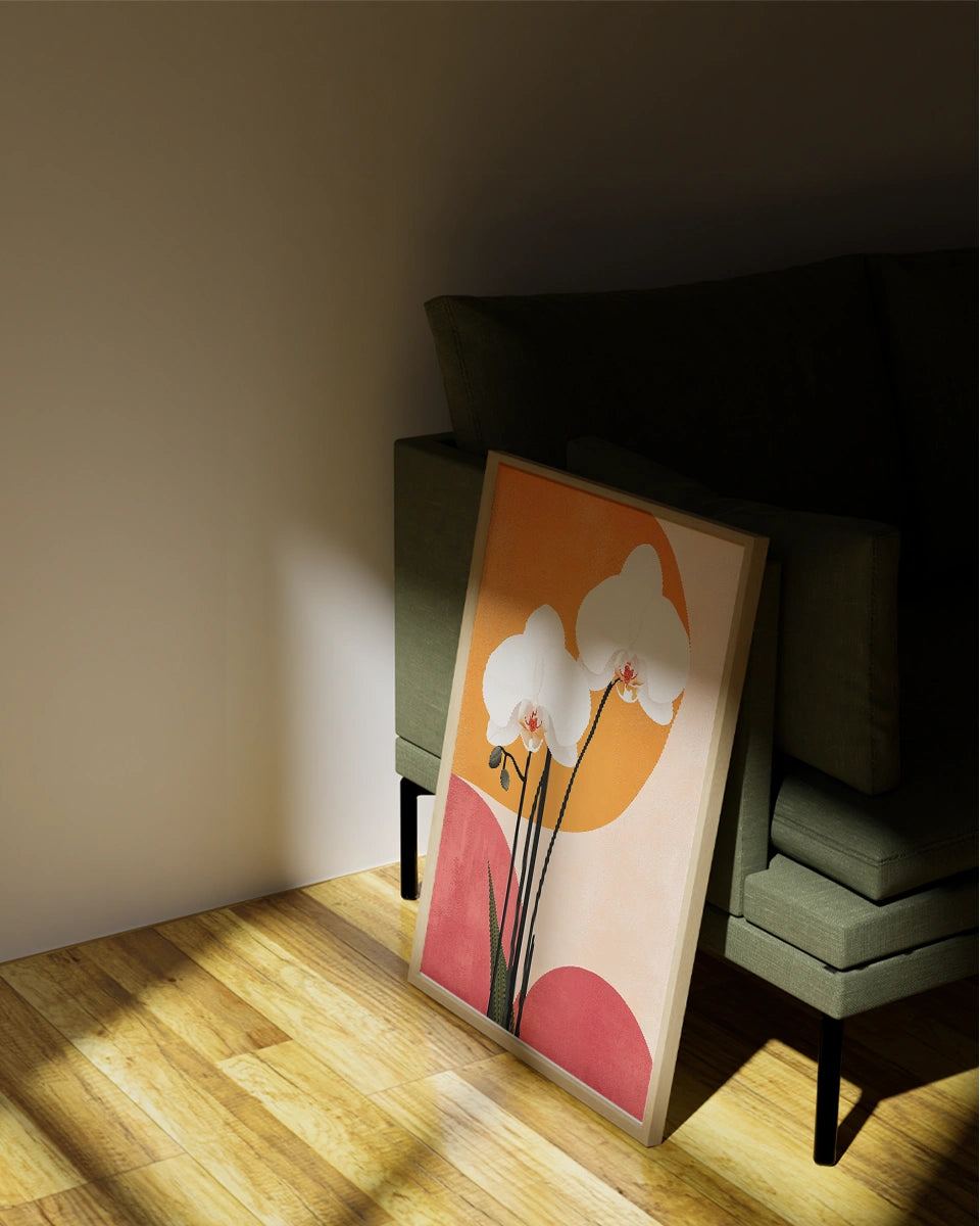 Poster - Minimalistische Illustratie - Twee Witte Orchideeën - Oranje en Roze Achtergrond - Zonnestralen