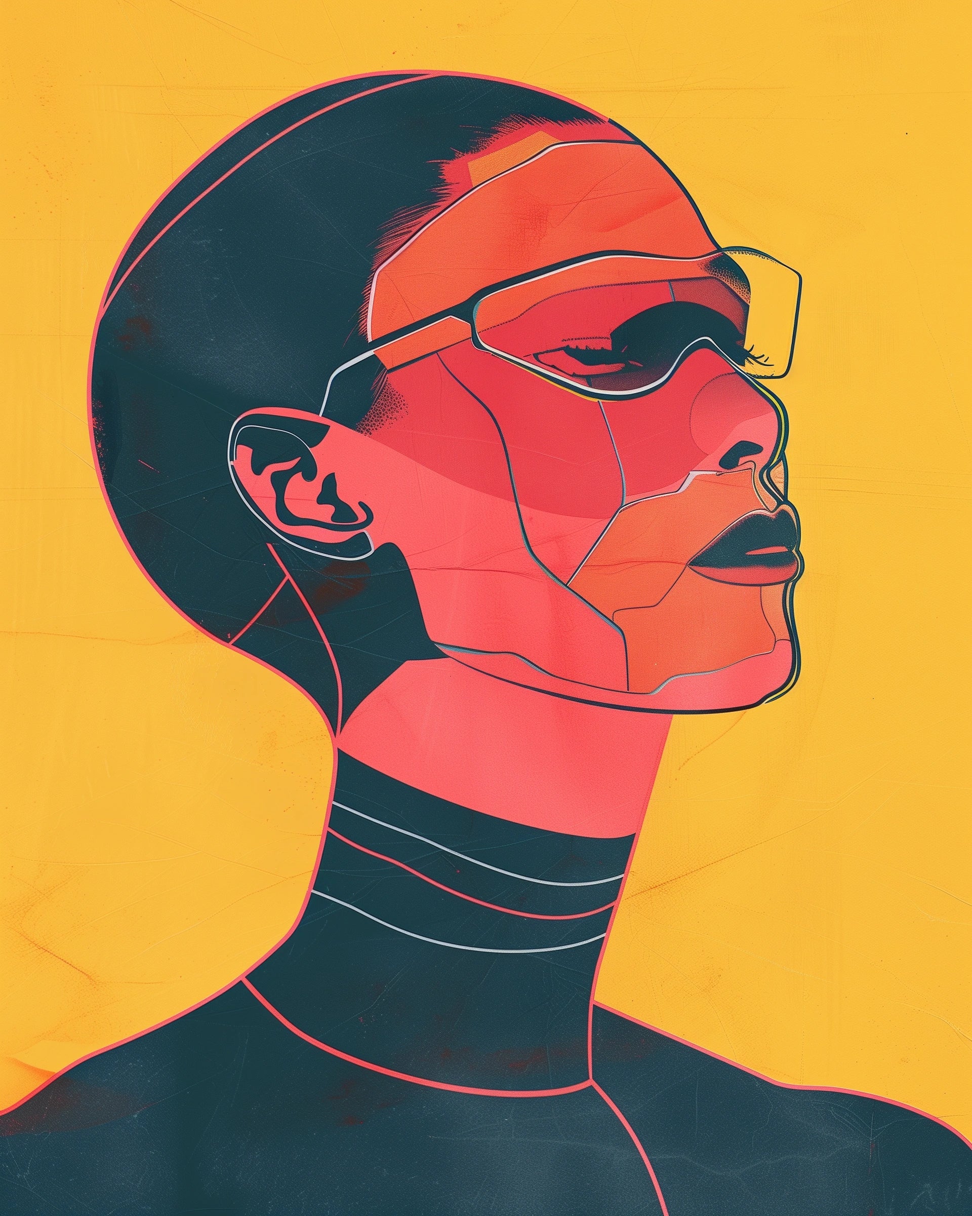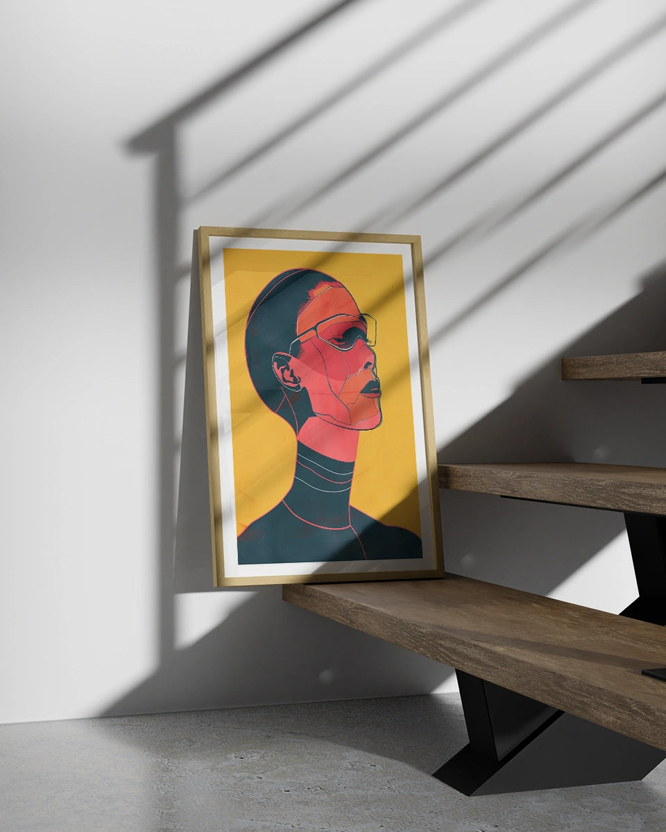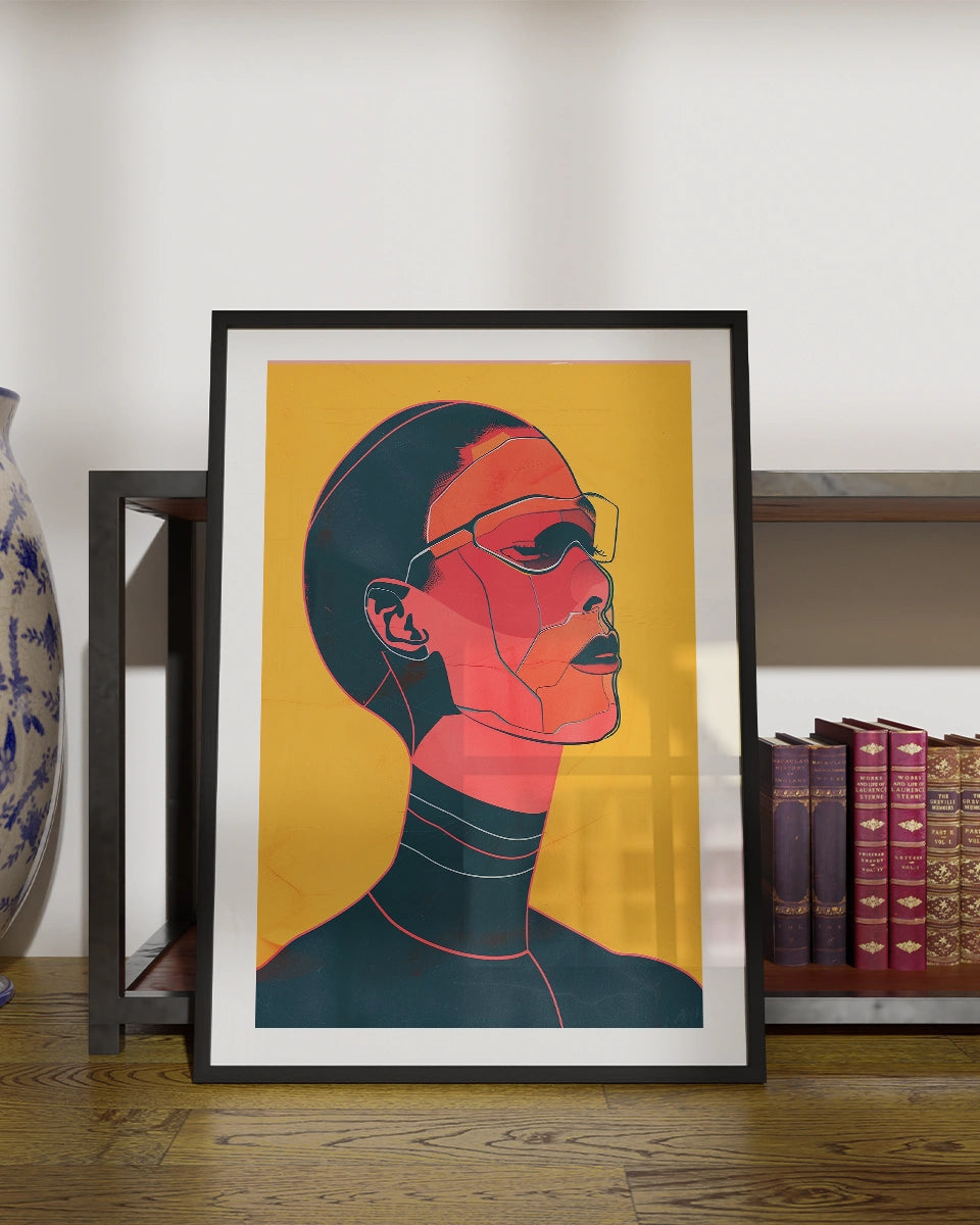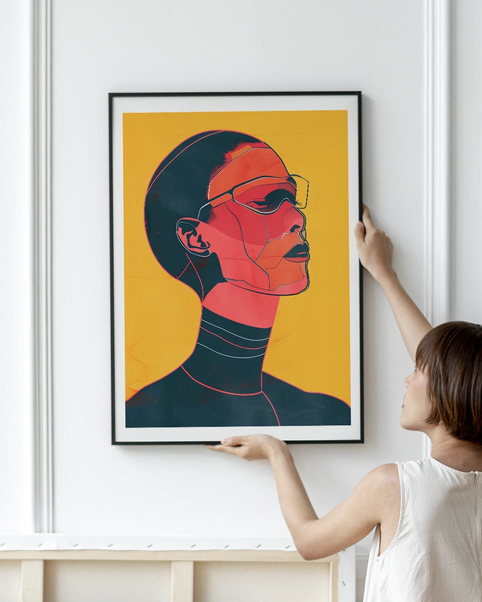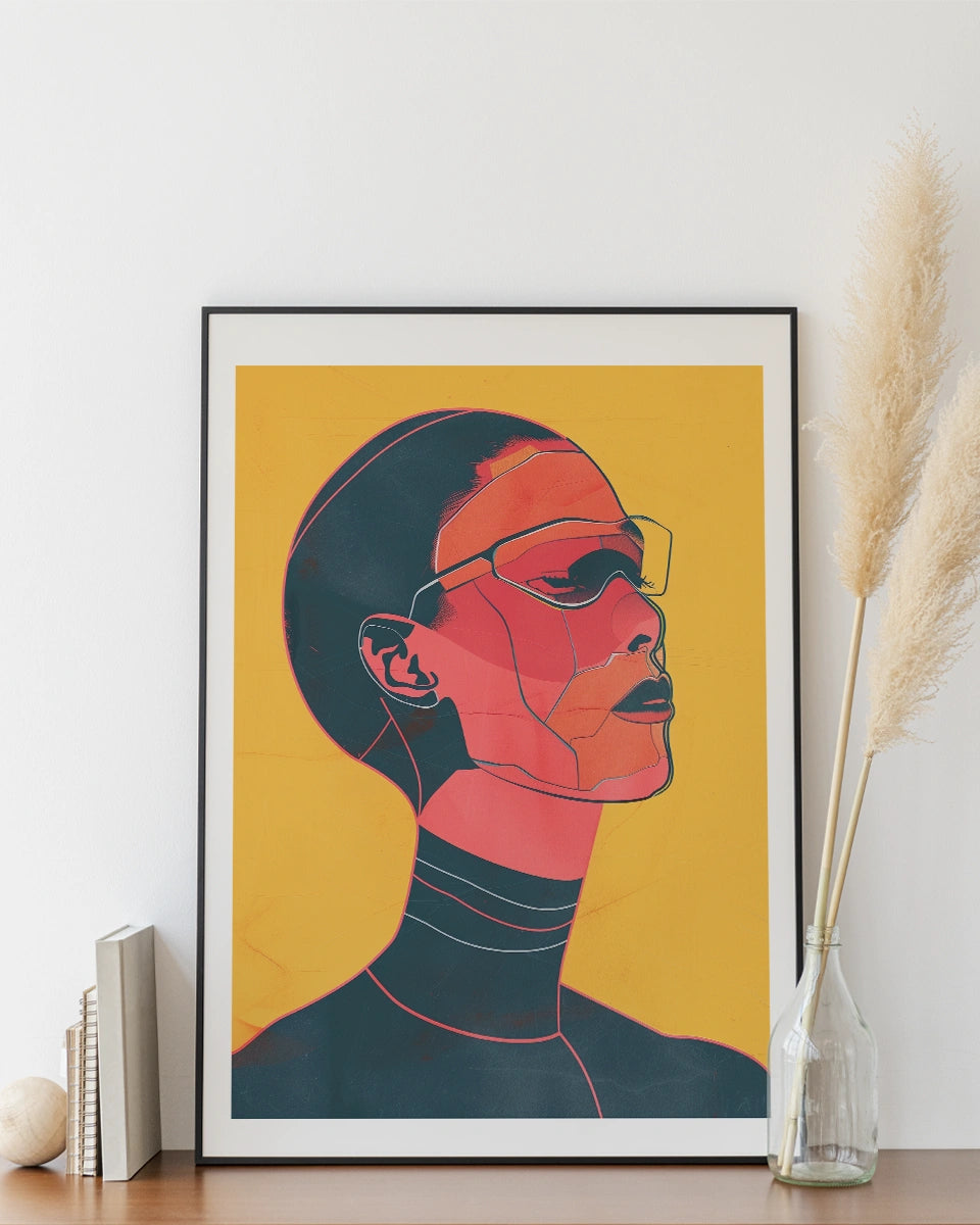 Verhoog de moderne uitstraling van je interieur met onze opvallende poster, die een platte illustratie van een portret van een cyberpunkvrouw met een bril toont. Dit kunstwerk is geïnspireerd door de stijlen van Pablo Picasso en Lily Seika Jones en combineert minimalistische esthetiek met een scherp, hedendaags ontwerp.
