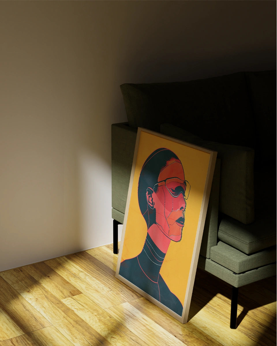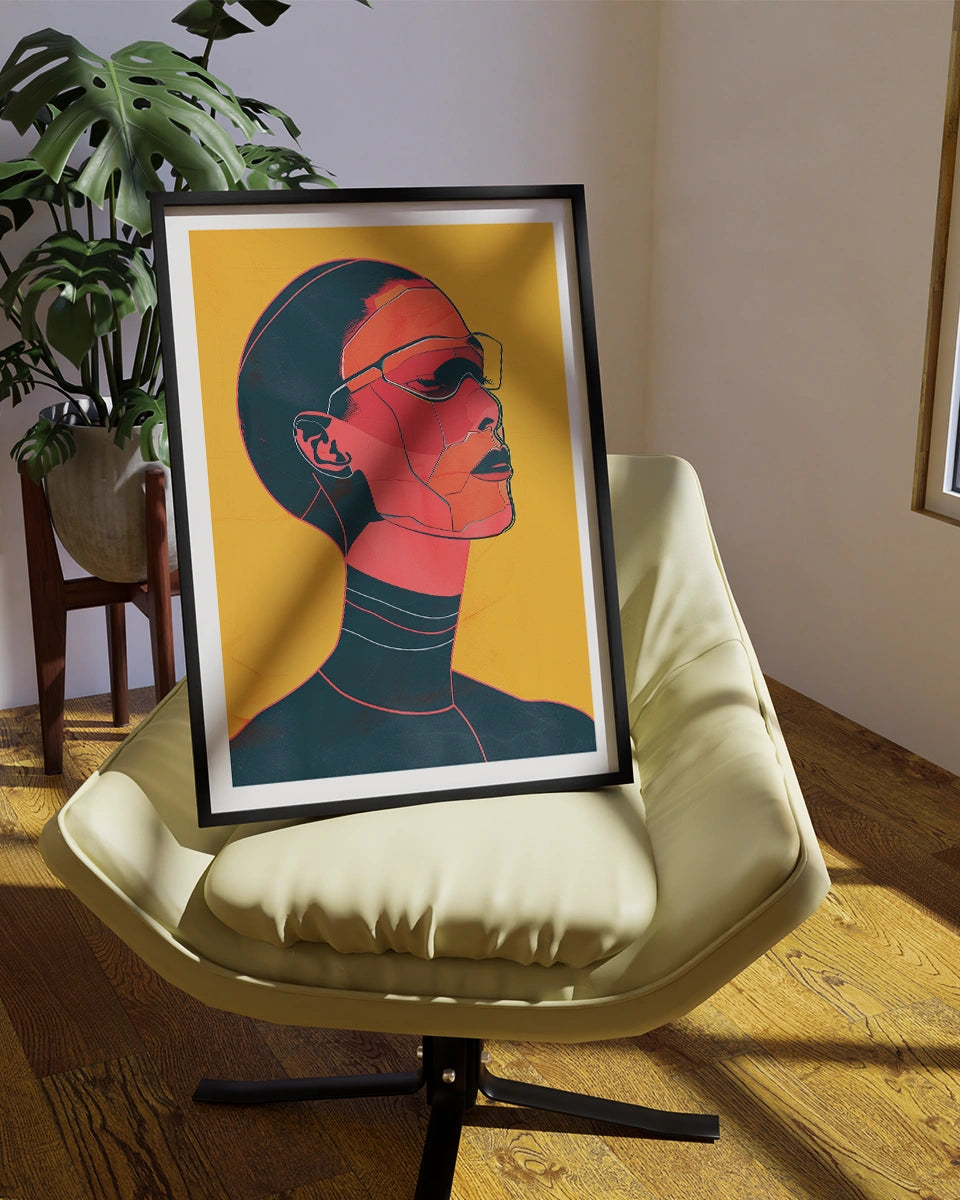 De poster is uitgevoerd in een plat ontwerp met eenvoudige vormen en opvallende lijnen, die samenkomen in een krachtig 2D-vectorillustratie. Het gebruik van een beperkt palet van effen kleuren—rood, zwart, geel en oranje—creëert een hoog contrast en benadrukt de grafische elementen van het portret. De afwezigheid van schaduwen en de vloeiende verlopen zorgen voor een schone en moderne uitstraling, terwijl de minimalistische achtergrond met negatieve ruimte de focus legt op de kern van het ontwerp.