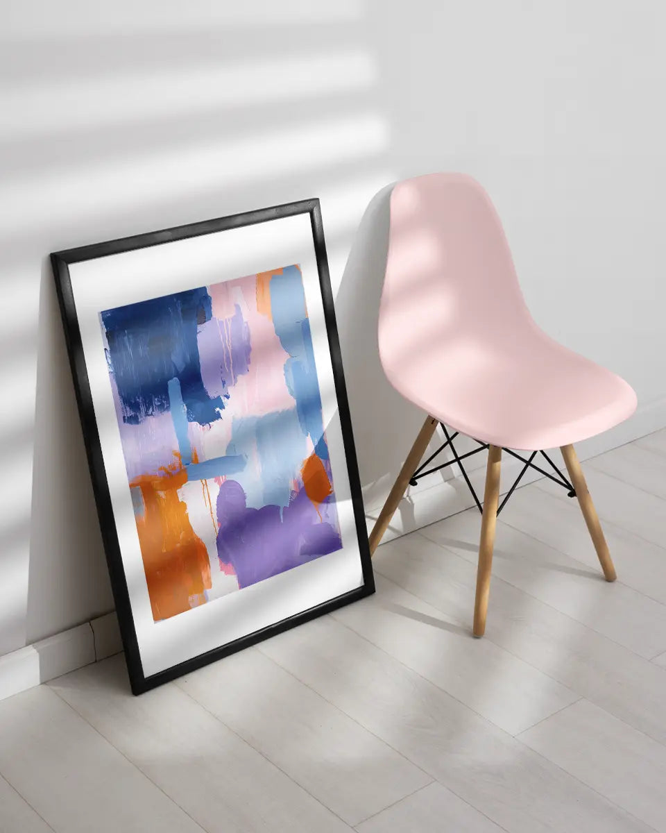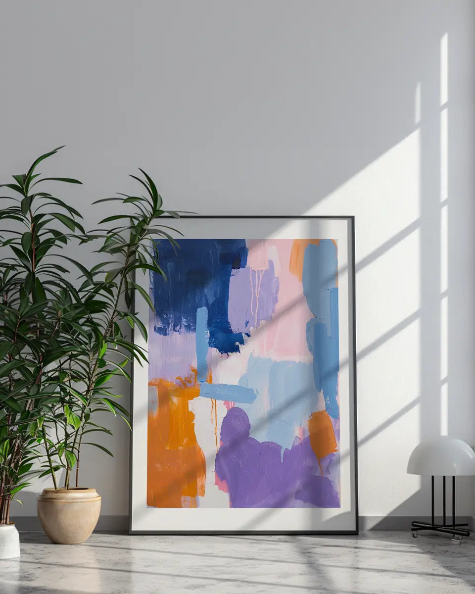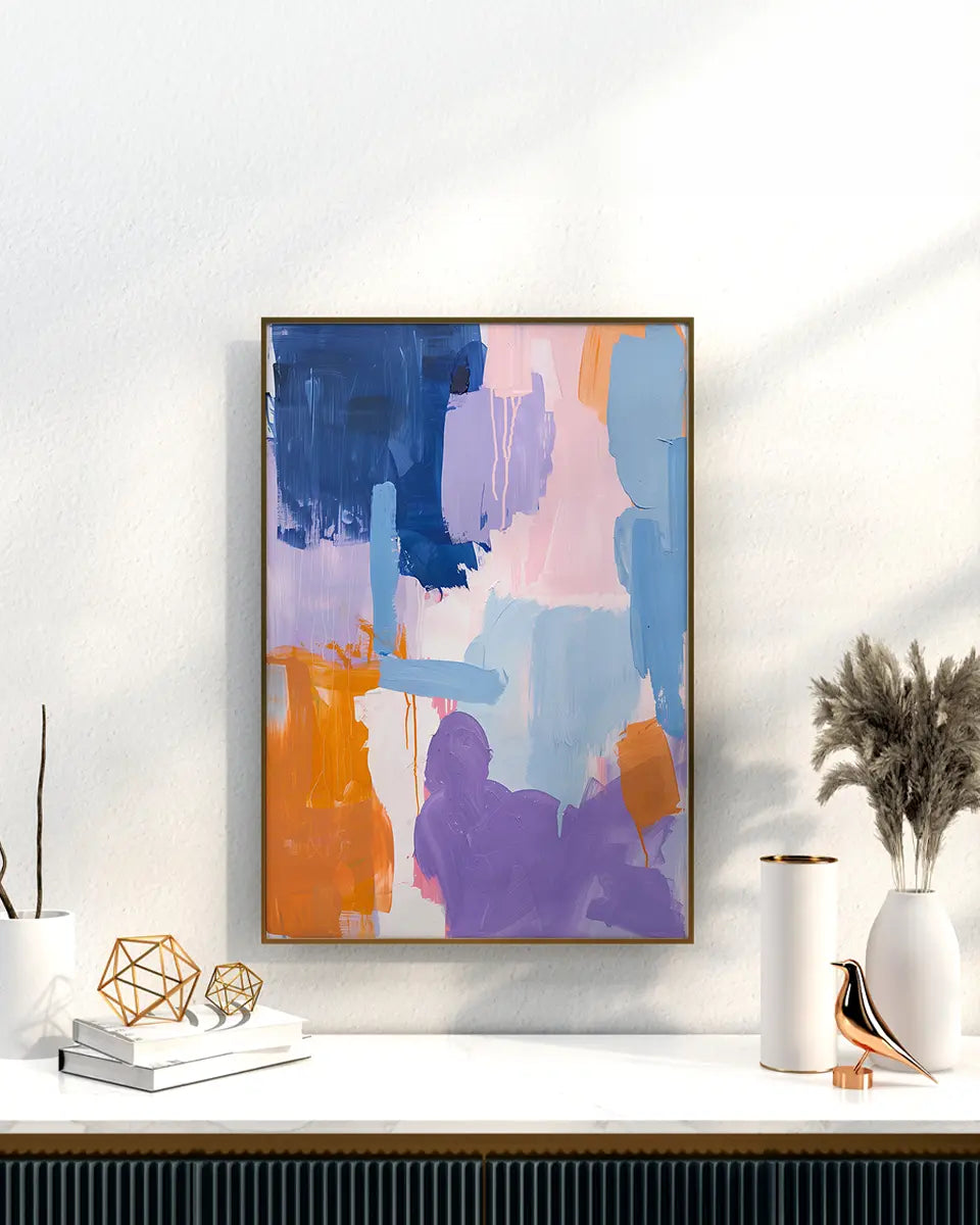 Het kleurenschema van lichtpaars, blauw en oranje is zowel modern als tijdloos. De zachte paarse tinten brengen een gevoel van sereniteit en introspectie, terwijl de blauwe en oranje vormen een speelse energie toevoegen. Deze kleurencombinatie maakt de poster geschikt voor een breed scala aan interieurs, van moderne woonkamers tot serene slaapkamers en inspirerende kantoorruimtes.