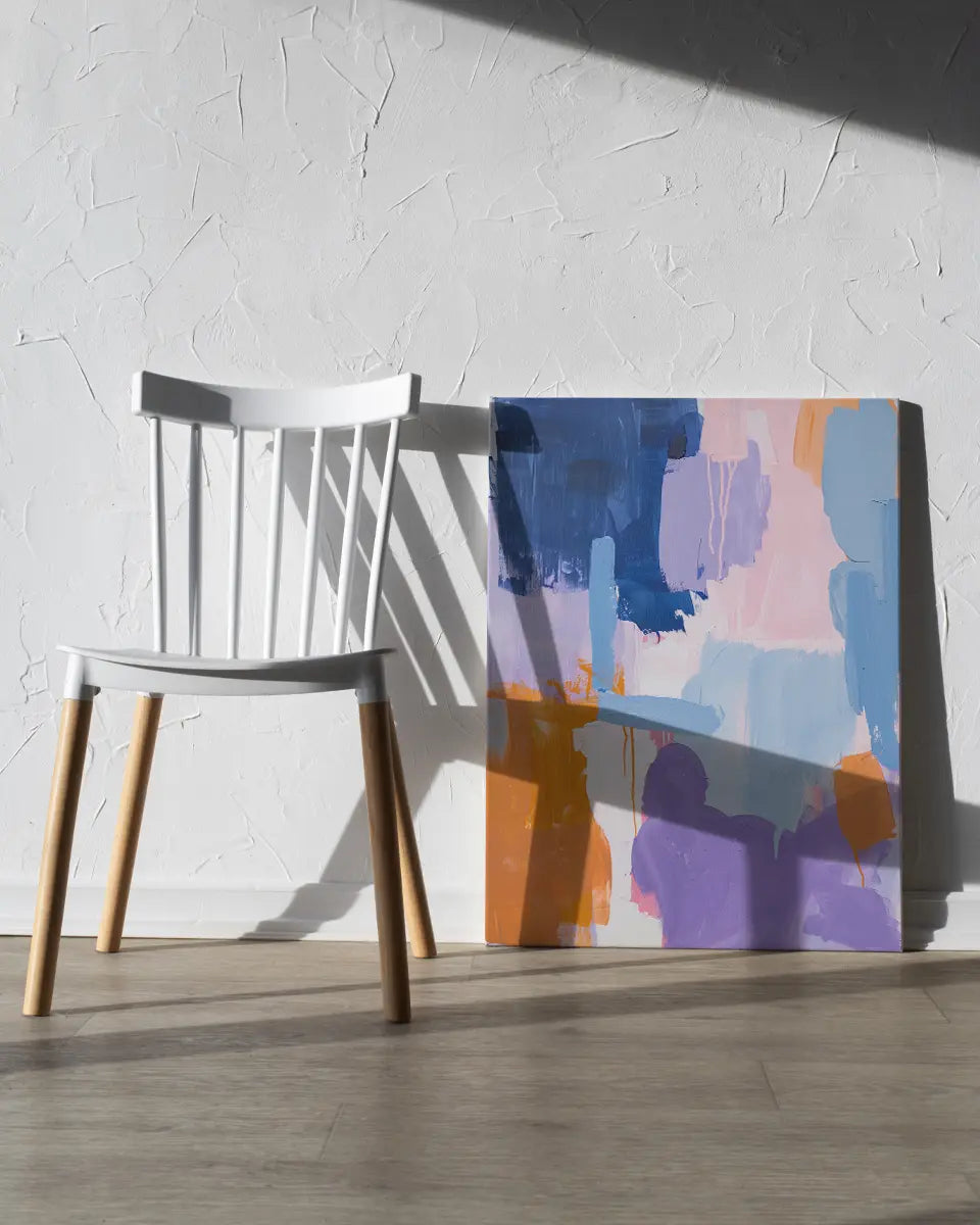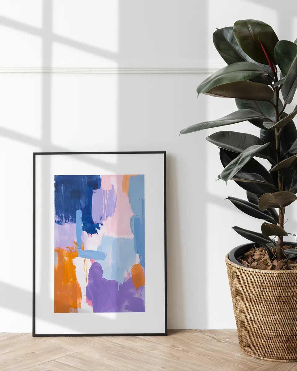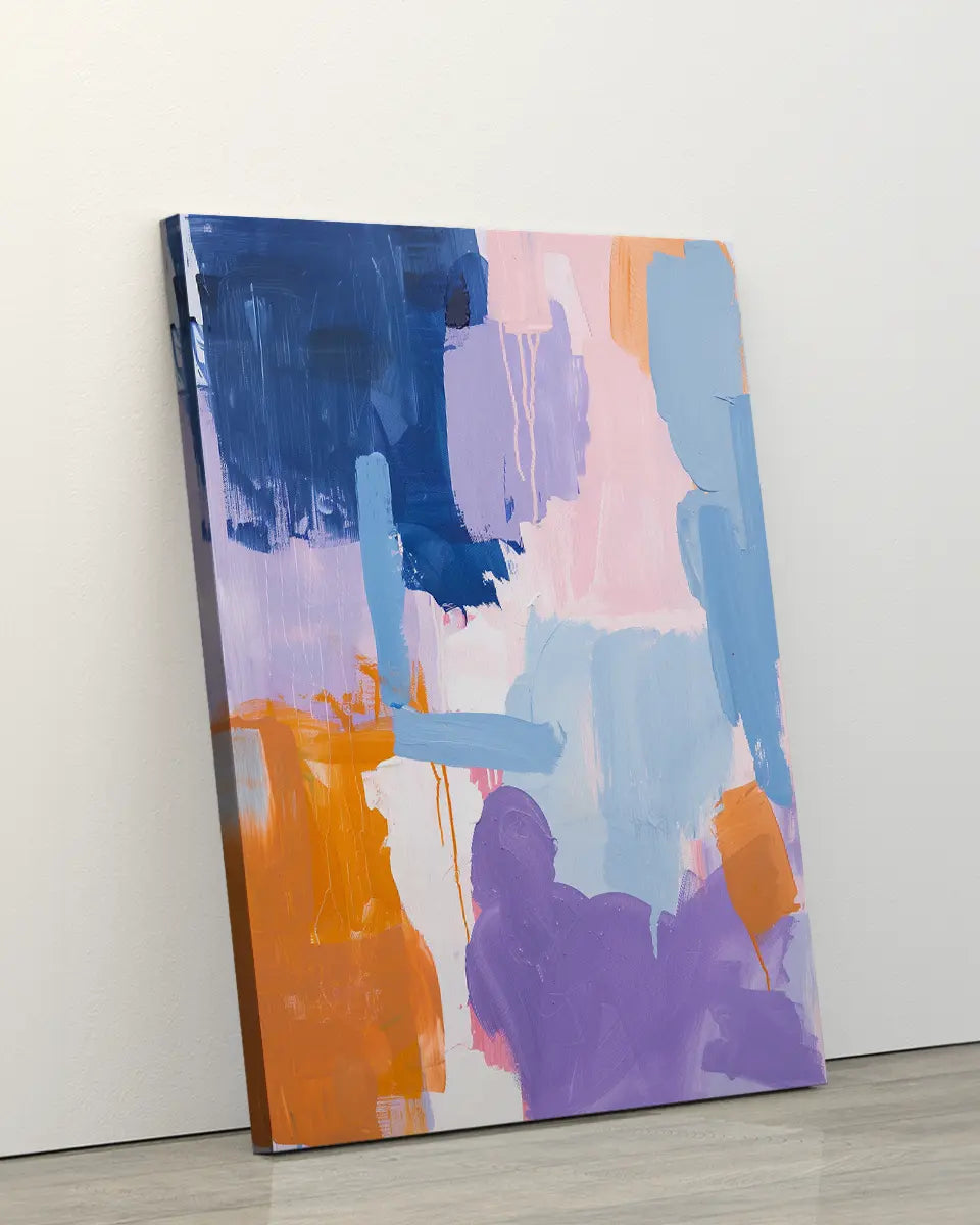 Het kleurenschema van lichtpaars, blauw en oranje is zowel modern als tijdloos. De zachte paarse tinten brengen een gevoel van sereniteit en introspectie, terwijl de blauwe en oranje vormen een speelse energie toevoegen. Deze kleurencombinatie maakt de poster geschikt voor een breed scala aan interieurs, van moderne woonkamers tot serene slaapkamers en inspirerende kantoorruimtes.