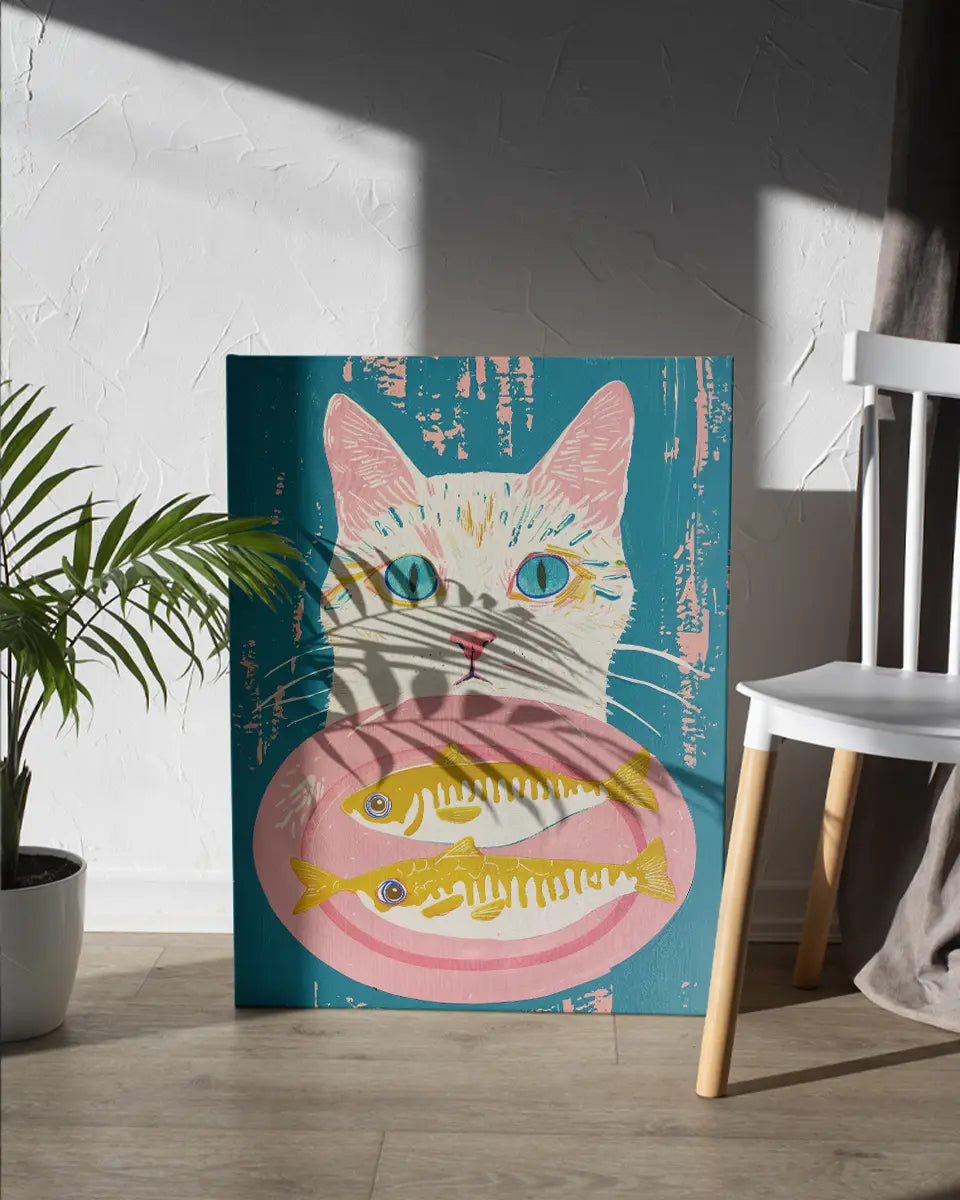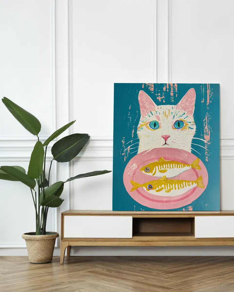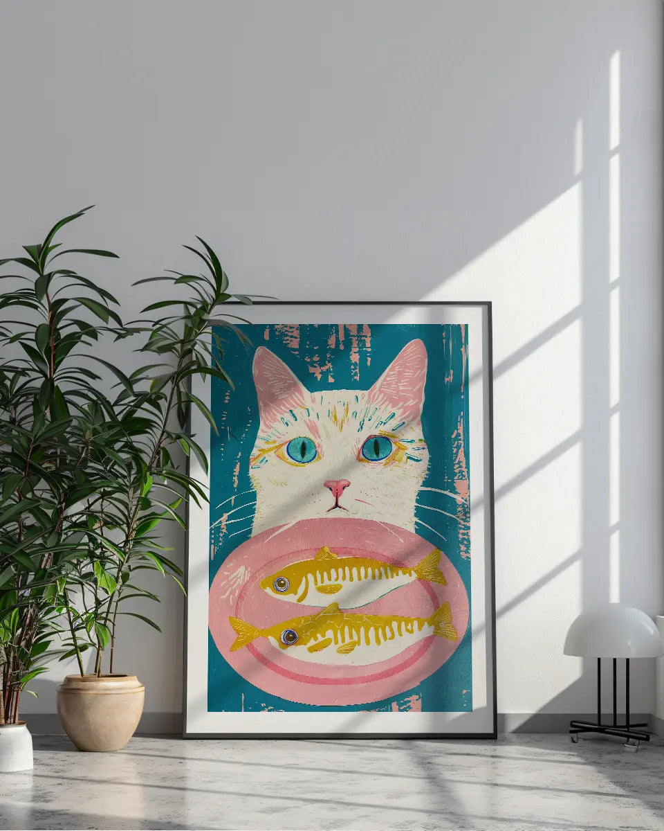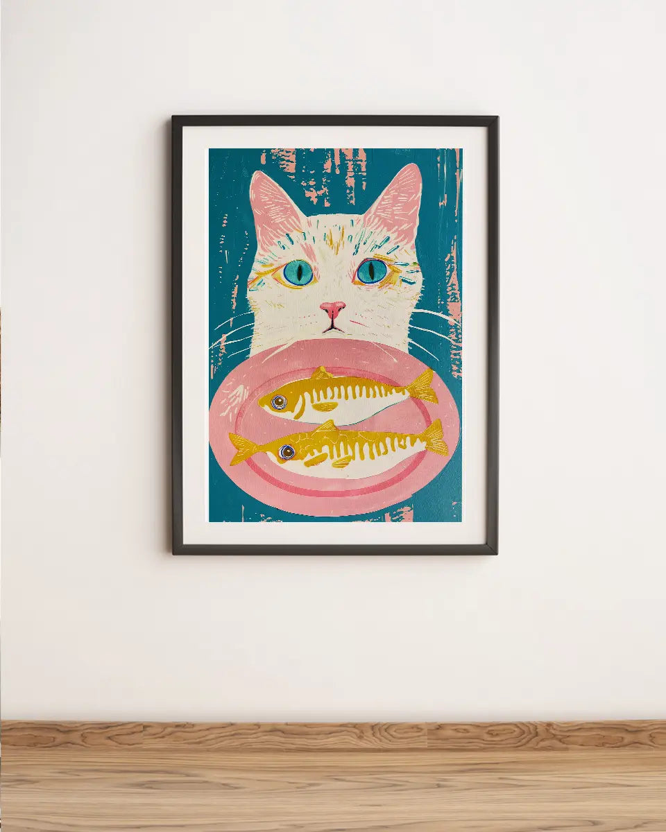 Het beeld van de kat, met zijn mysterieuze blauwe ogen, vangt de aandacht van de kijker en nodigt uit tot contemplatie. Zijn blik is vol verwondering en speelsheid terwijl hij de vissen op het roze bord bewondert. De eenvoudige maar expressieve lijnen van de kat brengen een gevoel van gratie en charme over, terwijl de pastelkleuren een vleugje zachtheid en warmte toevoegen aan het tafereel.