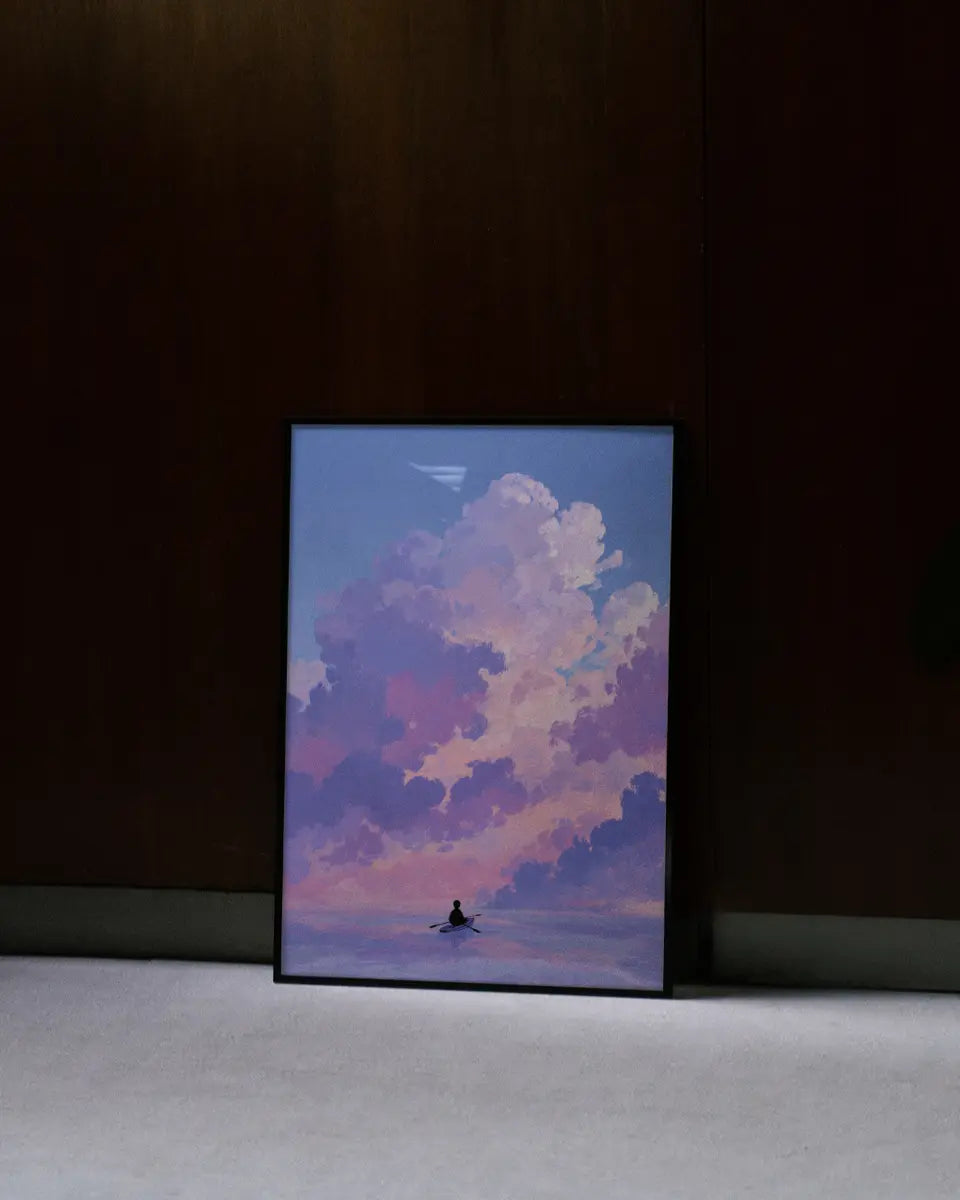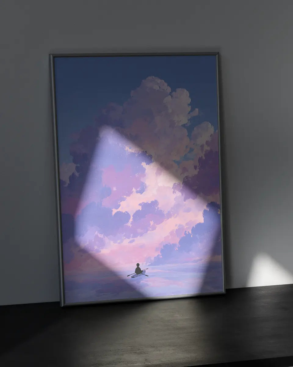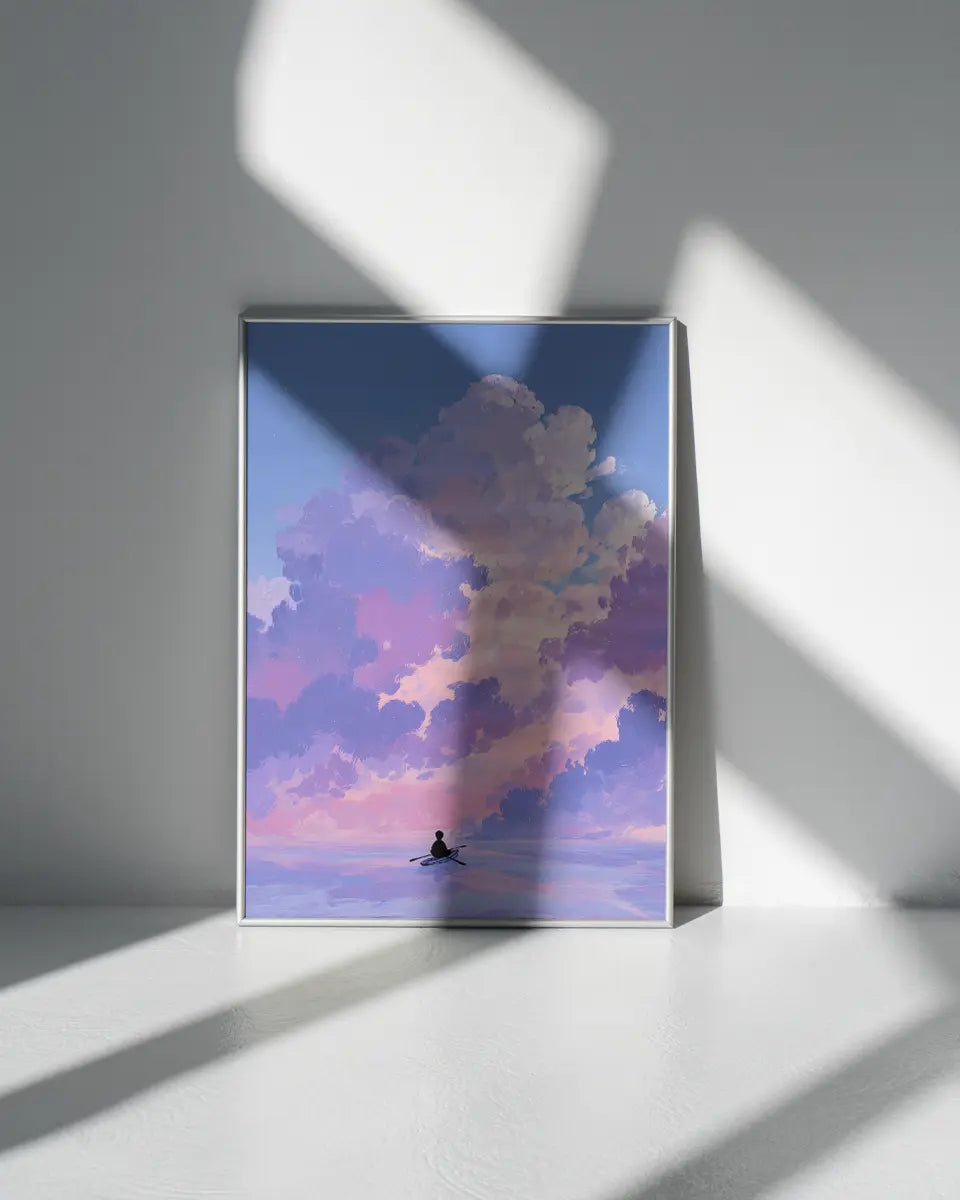 Deze minimalistische animeposter vangt een moment van rust en avontuur tegelijk. Een man roeit over een kalme zee, terwijl boven hem wolken in zachte roze- en paarstinten langzaam voorbij drijven. De compositie ademt eenvoud, maar de details – van de subtiele golfbewegingen tot de nuances in het kleurverloop – maken het beeld levendig en meeslepend.