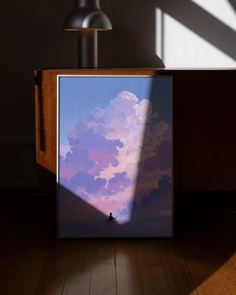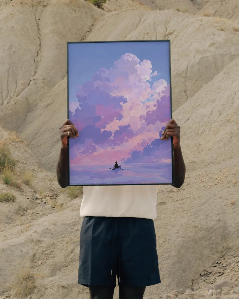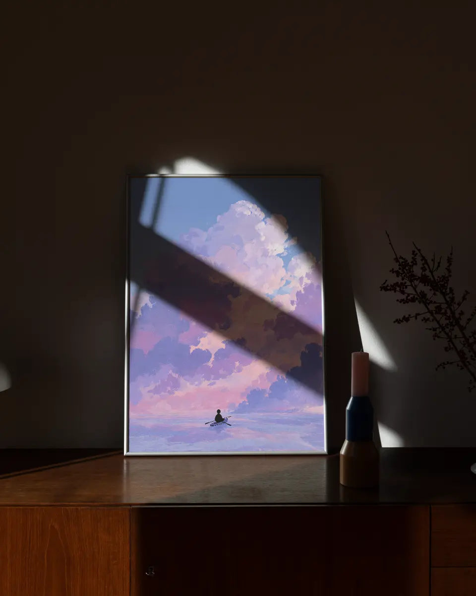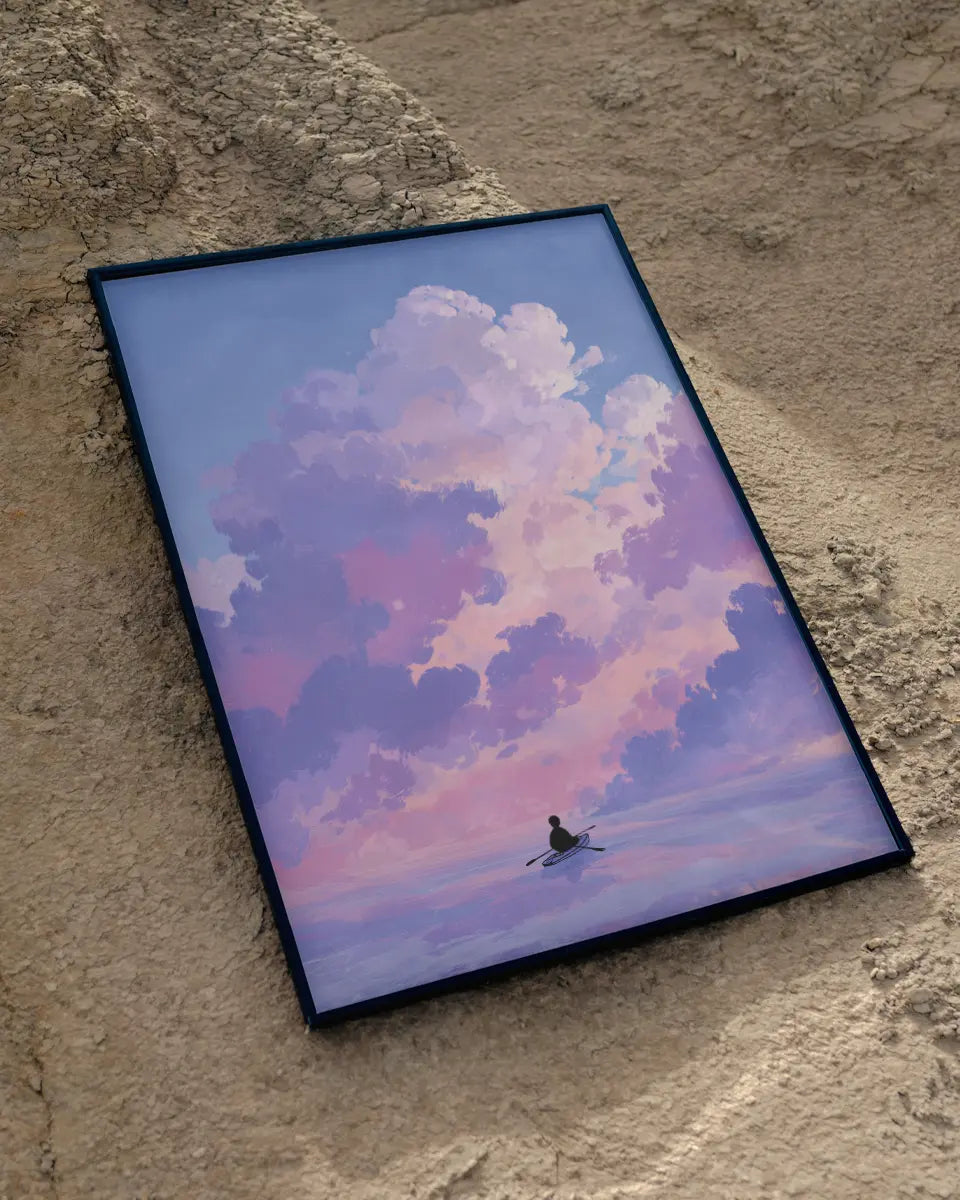 Deze minimalistische animeposter vangt een moment van rust en avontuur tegelijk. Een man roeit over een kalme zee, terwijl boven hem wolken in zachte roze- en paarstinten langzaam voorbij drijven. De compositie ademt eenvoud, maar de details – van de subtiele golfbewegingen tot de nuances in het kleurverloop – maken het beeld levendig en meeslepend.