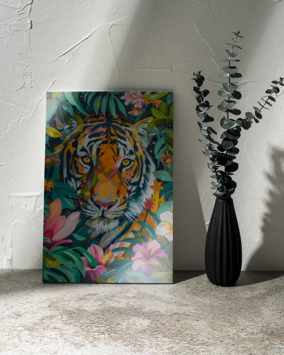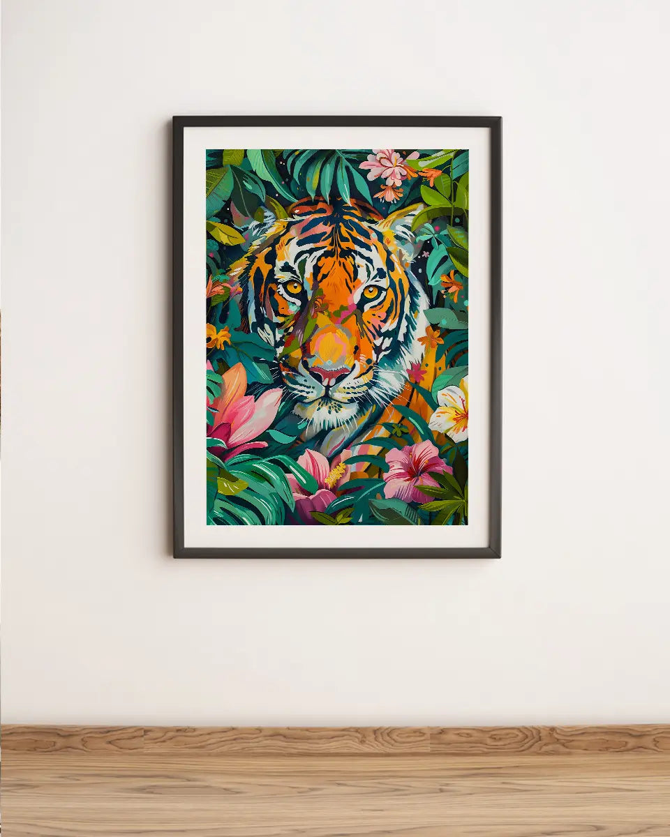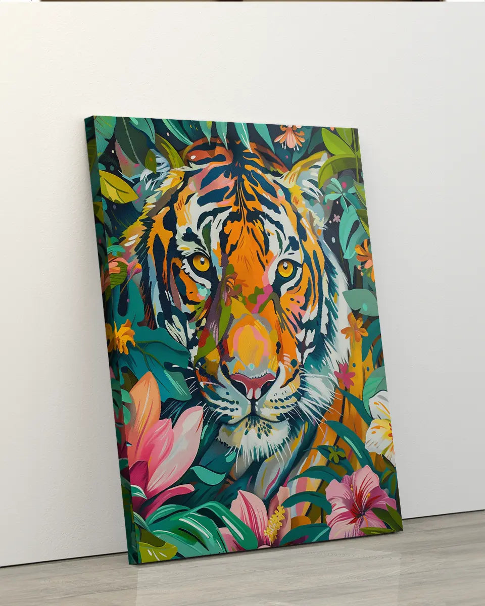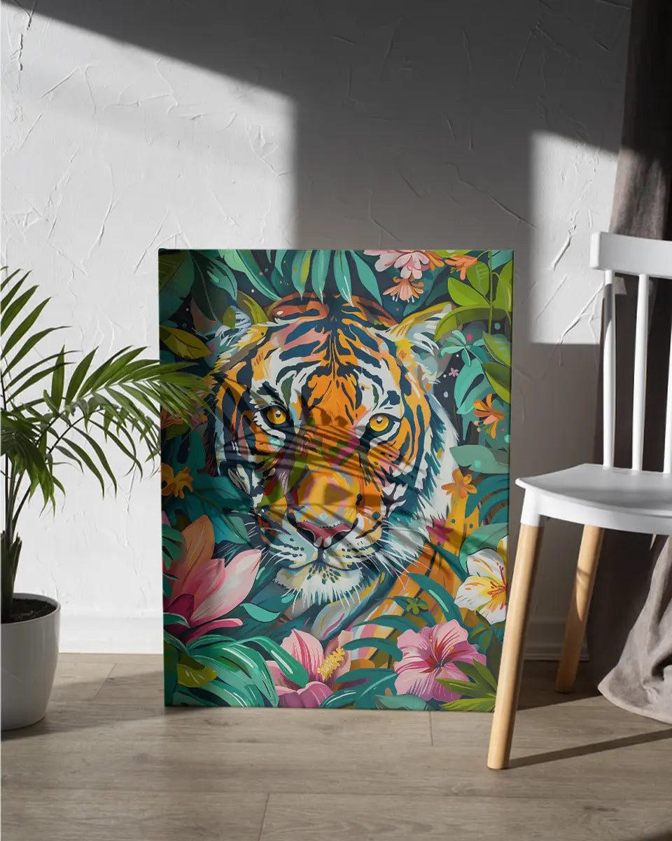Deze poster is een meesterwerk dat verschillende stijlen combineert: de levendige kleuren van aquarel, de rijke texturen van olieverf, en zachte penseelstreken die de schoonheid van de natuur op een unieke manier vastleggen. Het tijgergezicht straalt kracht en gratie uit, terwijl de omliggende tropische flora een serene en exotische sfeer creëert.